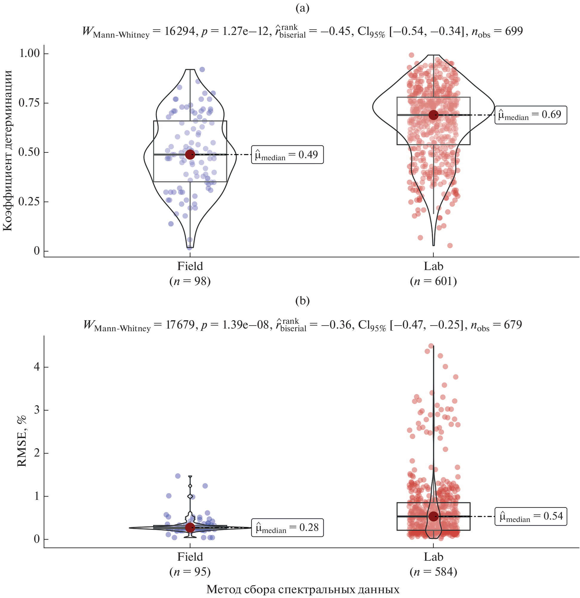 Выполнен обзор и метаанализ научных статей, посвященных оценке содержания органического углерода почв с применением подходов Vis-NIR спектроскопии. В обзор вошло 134 исследования, опубликованных в период с 1986 по 2022 гг. с общей выборкой в 709 значений количественных метрик. Поиск статей проводили в научных поисковых системах: РИНЦ, Science Direct, Scopus, Google Scholar по ключевым словосочетаниям: “спектроскопия почв” и “Vis-NIR spectroscopy AND soil organic carbon”. В процессе метаанализа при помощи непараметрического одностороннего дисперсионного анализа Краскела–Уоллиса в совокупности с непараметрическим методом попарного сравнения выполняли определение наличия статистически значимой разницы между медианными значениями принятых количественных метрик предсказательной силы моделей (коэффициента детерминации (\(R_{{{{{\text{cv}}} \mathord{\left/
