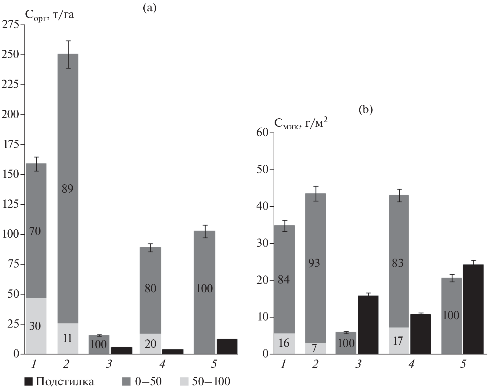 Azonal organo-accumulative soils (Umbrisols) on shungite rocks and the influence of type of land use on their properties and ecosystem carbon stocks were investigated. Сhanges in soil profile structure, basic agrochemical and microbiological indicators of upper horizons, Corg and Cmik stocks in a meter layer of soils and sites carbon pool structure were analyzed. Pine forest as a control, arable land, hayfield, as well as young alder and middle-aged mixed forest were studied. Land use change does not lead to a significant transformation of the properties of shungite soils in contrast to zonal soils. The removal of stones has the greatest influence, leading to the formation of developed arable horizons. The soils are characterized by a high stony, a weak-divided thin profile, low density values, and a pH close to neutral. The wide range of Corg content values from 1.6% to 11.7% is due to the heterogeneous composition of parent rocks. Agricultural development contributes to the accumulation of exchangeable bases, available potassium and phosphorus, the content of which are initially increased in schungite soils. All sites are characterized by a high rate of organic matter mineralization (C/N ratio not higher than 17). A small content of Cmic (84–245 mg C/kg) was noted in the soils, which may be due to the low availability of substrate because of lithogenic origin of carbon and the increased concentrations of heavy metals and lanthanides in schungite rocks. The structure of Corg and Сmic stocks depends on carbon content, keep of stones and presence of dense bedrock. Soil organic carbon stocks range from 17–251 t C/ha, while Cmic stocks range from 6–43 g C/m2. The total ecosystem carbon stocks are maximum in hayfield (259 t C/ha) and minimum in young forest (74 t C/ha). The stocks of carbon in the sites of arable land, middle-aged and control forests are within 169–211 t C/ha.