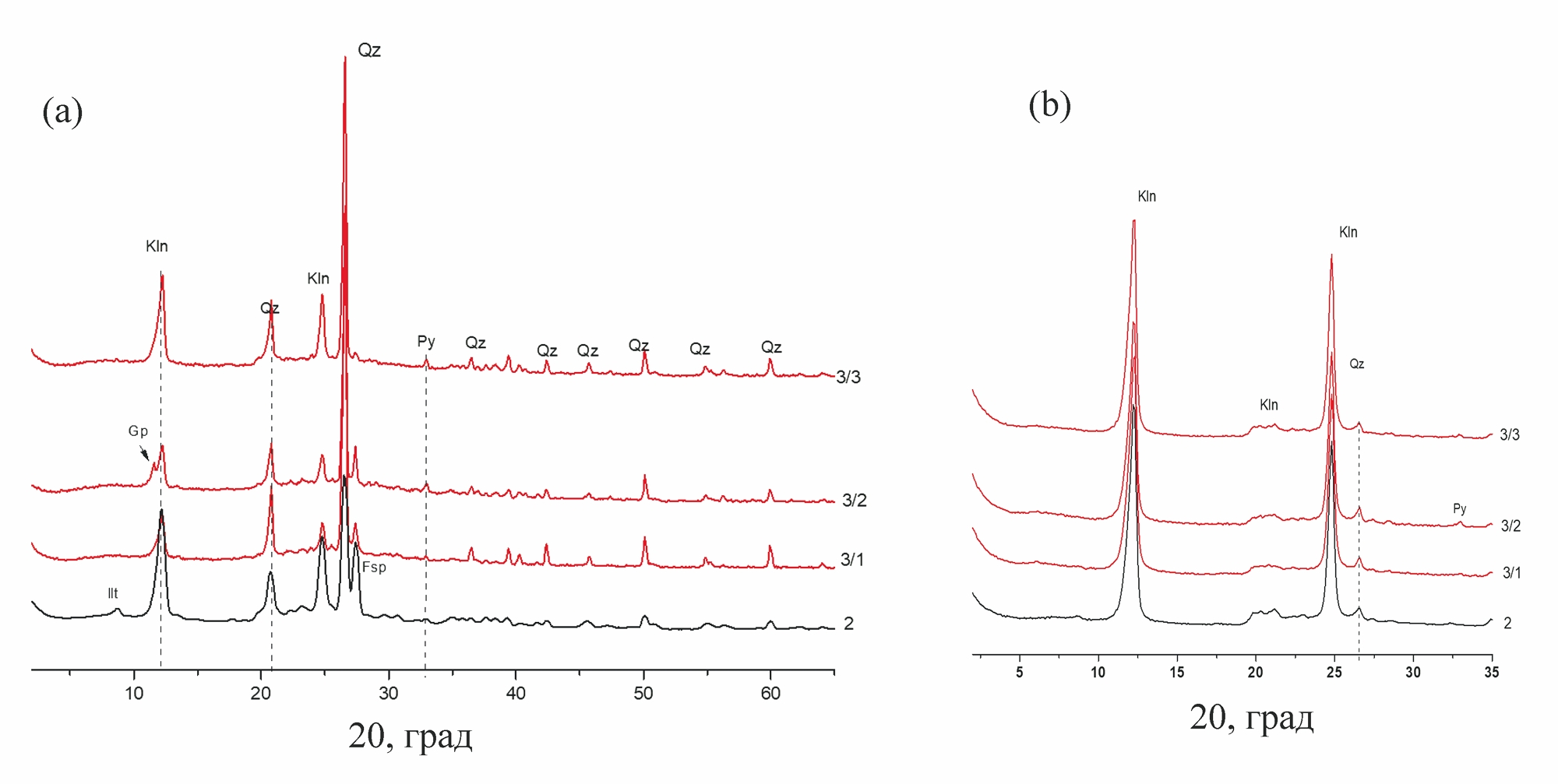 Рис. 2. Минеральный состав палеопочвы (профиль PV22-2 слои 3/1–3/3; и материал коры выветривания – слой 2, см. табл. 1): a – валовые образцы; b – фракция <2 мкм, образцы насыщены Mg²⁺, воздушно-сухие (данные рентгеновской дифрактометрии). Обозначения: Ilt – иллит, Kln – каолинит, Qz – кварц, Fsp – полевой шпат, Gp – гипс, Py – пирит.