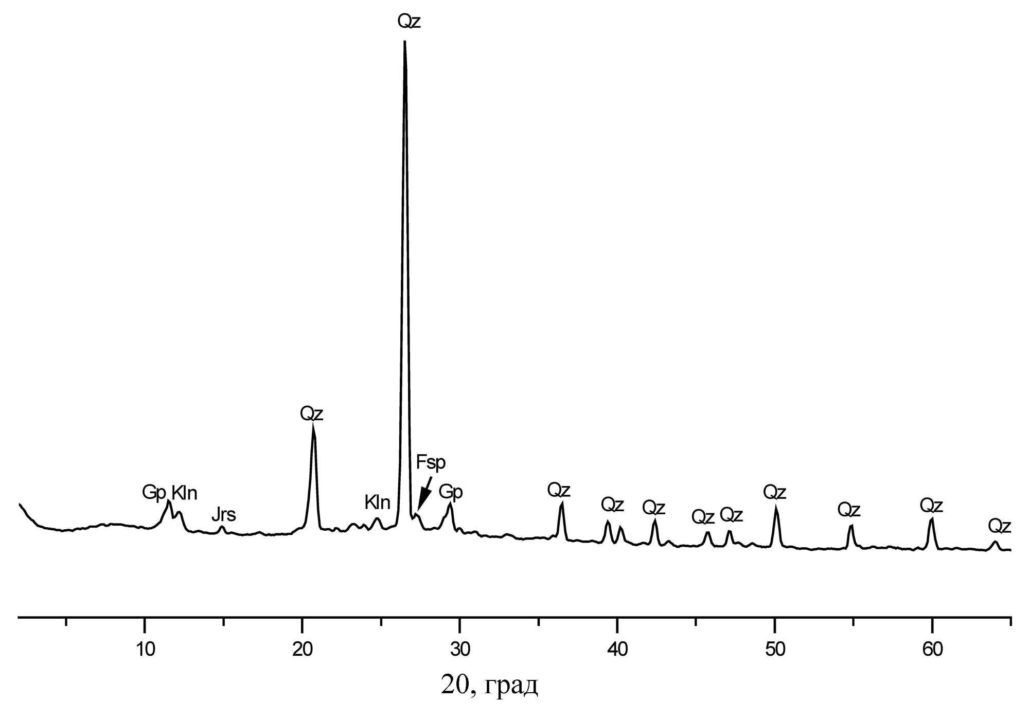 Рис. 4. Минеральный состав Fe-гипсовых нодулей (слой 3/1, профиль PV21-4 (данные рентгеновской дифрактометрии). Обозначения: Kln – каолинит, Qz – кварц, Fsp – полевой шпат, Gp – гипс, Jrs – ярозит.
