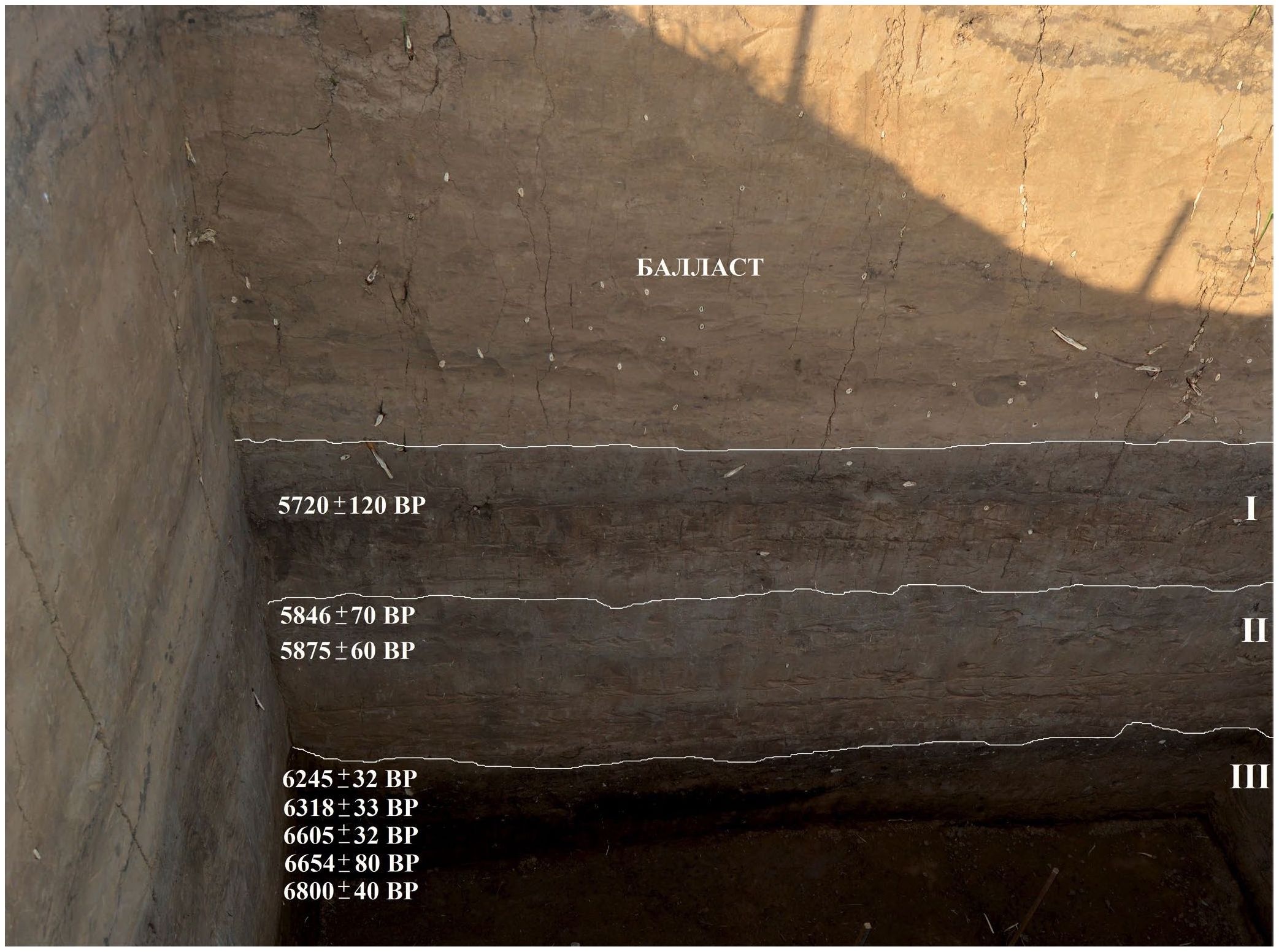 Рис. 2. Фото стенки археологического раскопа поселения “Алгай”, разрез 1–2021. Глубина разреза 3.5 м. Верхние 1.5 м от поверхности балласт. Приведены данные радиоуглеродного возраста. I – верхняя современная голоценовая почва, II – средняя голоценовая погребенная почва, III – нижняя голоценовая погребенная почва.