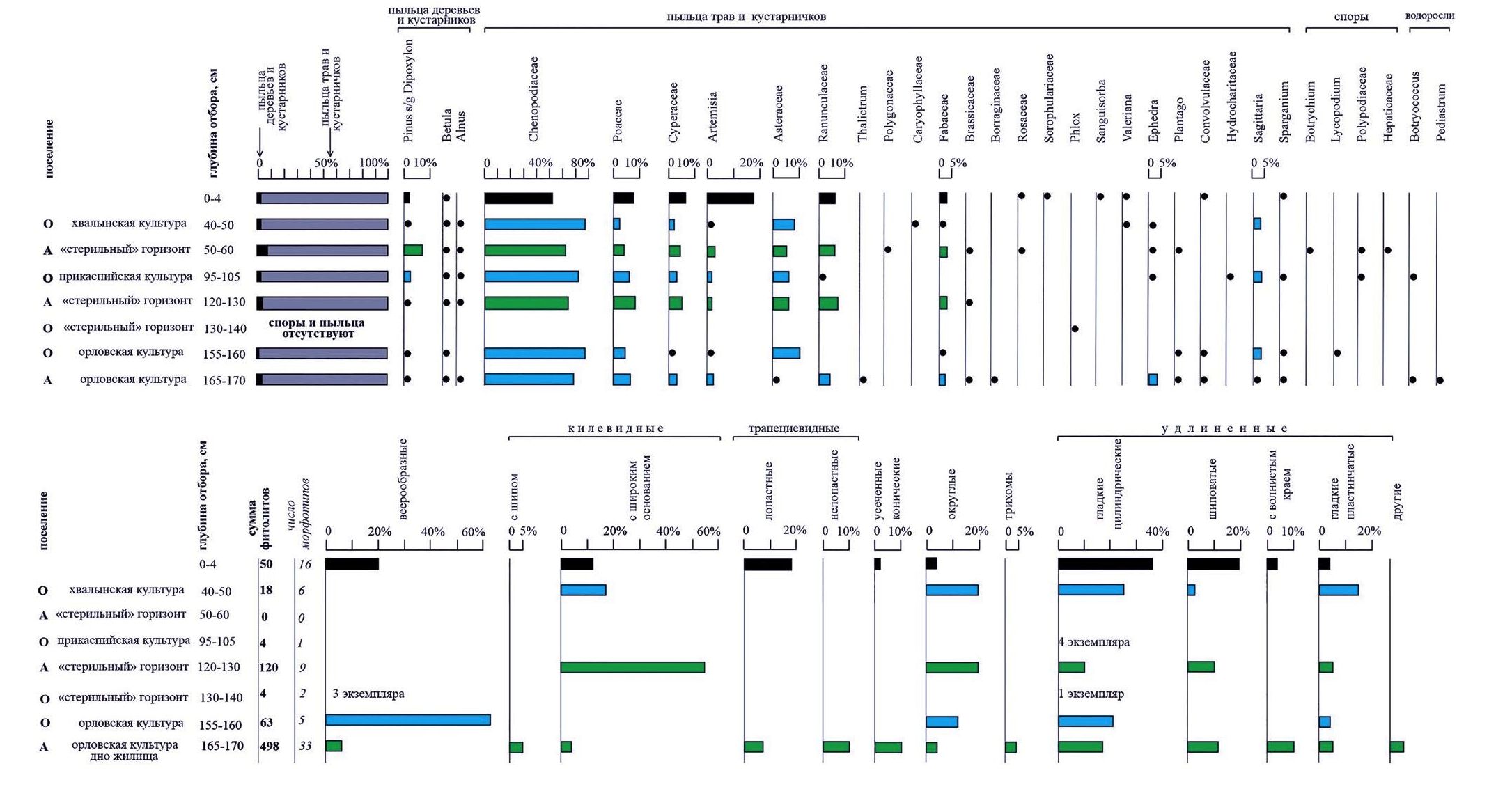В КС хвалынской культуры (современная голоценовая почва, индекс I) количество фитолитов резко снижается, доминируют удлиненные гладкие цилиндрические (elongate cylindrical) и пластинчатые (tabular) формы, килевидные с широким основанием (acute bulbosus with wide base) и округлые (spheroid psilate). В мацерате “стерильного” горизонта стоянки “Алгай”, разделяющего КС хвалынской и прикаспийской культур (горизонт на границе со средней погребенной голоценовой почвой, индекс II) фитолиты отсутствуют. Комплекс фитолитов КС прикаспийской культуры содержит единичные удлиненные цилиндрические (elongate cylindrical) формы. В слое “стерильного” горизонта стоянки “Алгай”, разделяющего КС прикаспийской и орловской культур, выявлена высокая насыщенность фитолитами при небольшом их разнообразии. Более половины составляют килевидные формы с широким основанием (acute bulbosus with wide base). В меньшем количестве определены округлые (spheroid psilate), удлиненные гладкие цилиндрические (elongate cylindrical) и пластинчатые (elongate tabular) формы, удлиненные шиповатые (elongate dentate). Комплекс фитолитов из КС орловской культуры поселения стоянки “Орошаемое” отличается меньшим разнообразием форм. В нем отмечено высокое содержание группы веерообразных форм (bulliform flabellate), а также зафиксированы удлиненные гладкие (elongate cylindrical) и округлые (spheroid psilate) фитолиты. В спектре пробы, отобранной со дна жилища орловской культуры (горизонт [A14B]ca, глубина отбора 165–170 см) поселения стоянки “Алгай”, зафиксировано максимальное содержание фитолитов (498 экземпляров), при наибольшем их разнообразии (определено 33 морфотипа). Преобладают средне- и крупноразмерные фитолиты (50–150 мкм). В мацерате отмечено большое количество детрита – обугленных и лигнифицированных тканей растений. В комплексе фитолитов преобладают разнообразные формы удлиненных (elongate) и трапециевидных лопастных (crenate) групп. Подчеркнем присутствие относящихся к тростнику веерообразных (bulliform flabellate) форм и килевидных форм с шипом (acute bulbosus with prickle), вероятно, сформированных по краям листа этого растения, а также округлых (spheroid psilate) и длинных с волнистым (петельчатым) краем (elongate with columnar margins), характерных для данного рода. Заметную роль играют удлиненные шиповатые (elongate dentate) формы и усеченные конические (rondel). Килевидные формы с широким основанием (acute bulbosus with wide base) зафиксированы в незначительном количестве. В мацерате данной пробы отмечено высокое содержание спикул губок (44 целых и 34 обломки), а также единичные панцири диатомовых водорослей.