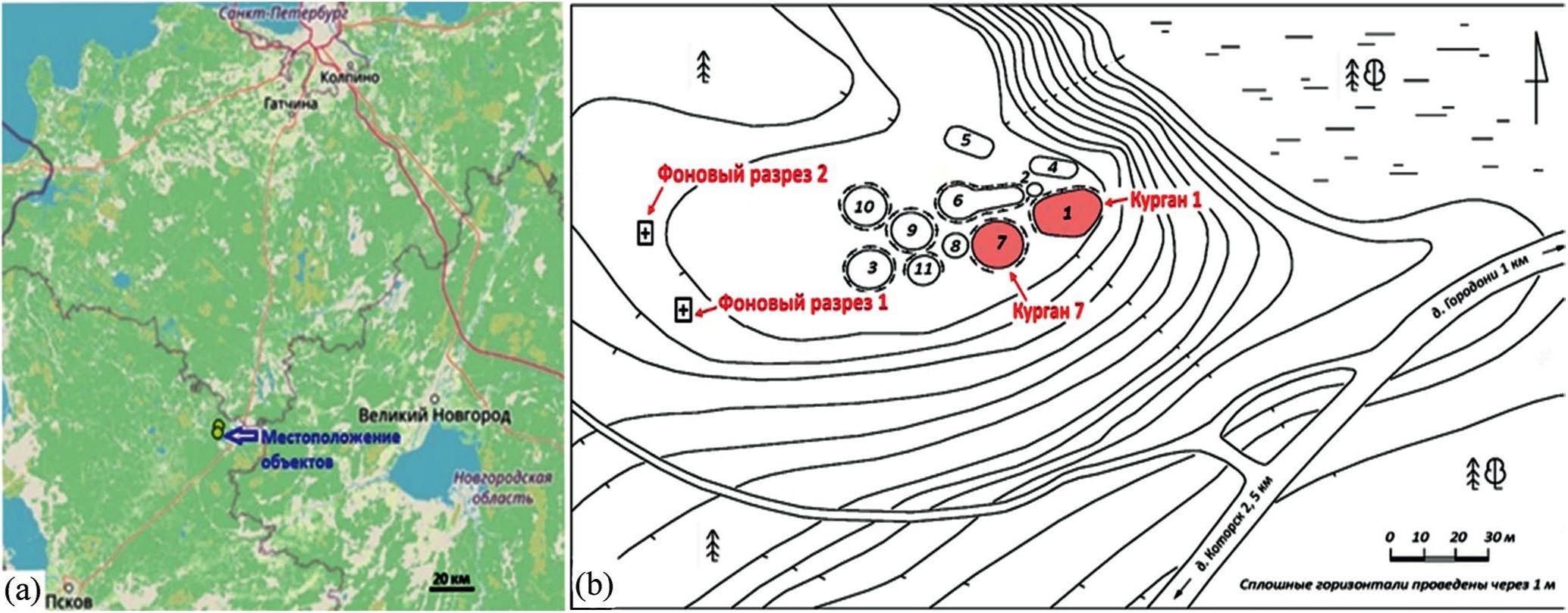 Материал для данной работы был собран в ходе экспедиции в Плюсский район Псковской области в сентябре 2021 г. Объект располагается в 2.5 км к востоку от д. Которск (рис. 1а). Представлены результаты изучения двух курганов, отнесенных археологами к IX в. н. э. (курган 7) и началу XI в. н. э. (курган 1) в курганном могильнике Которск XII [19].