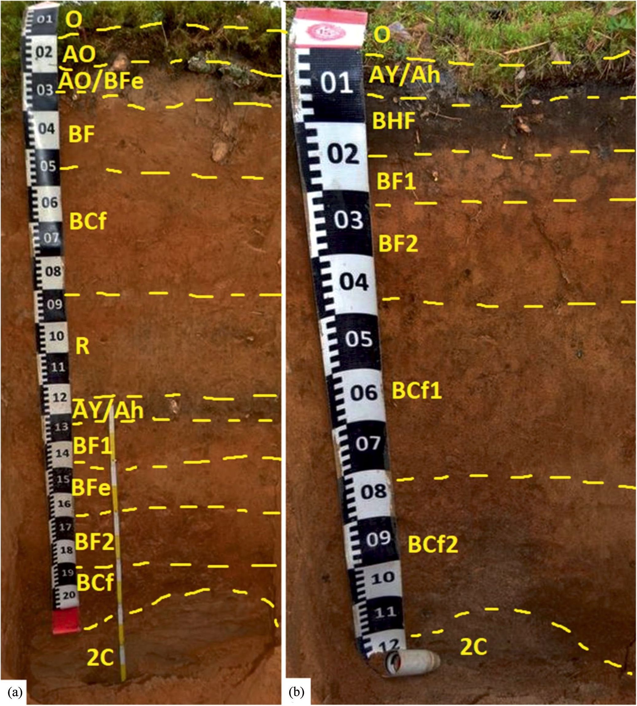 - – погребенная почва (AY/Ah(0–8 см)/BF1(8–25 см)/Bfe(25–42 см)/BF2(42–63 см)/BCf(63–98 см)/2C(98–120 см));