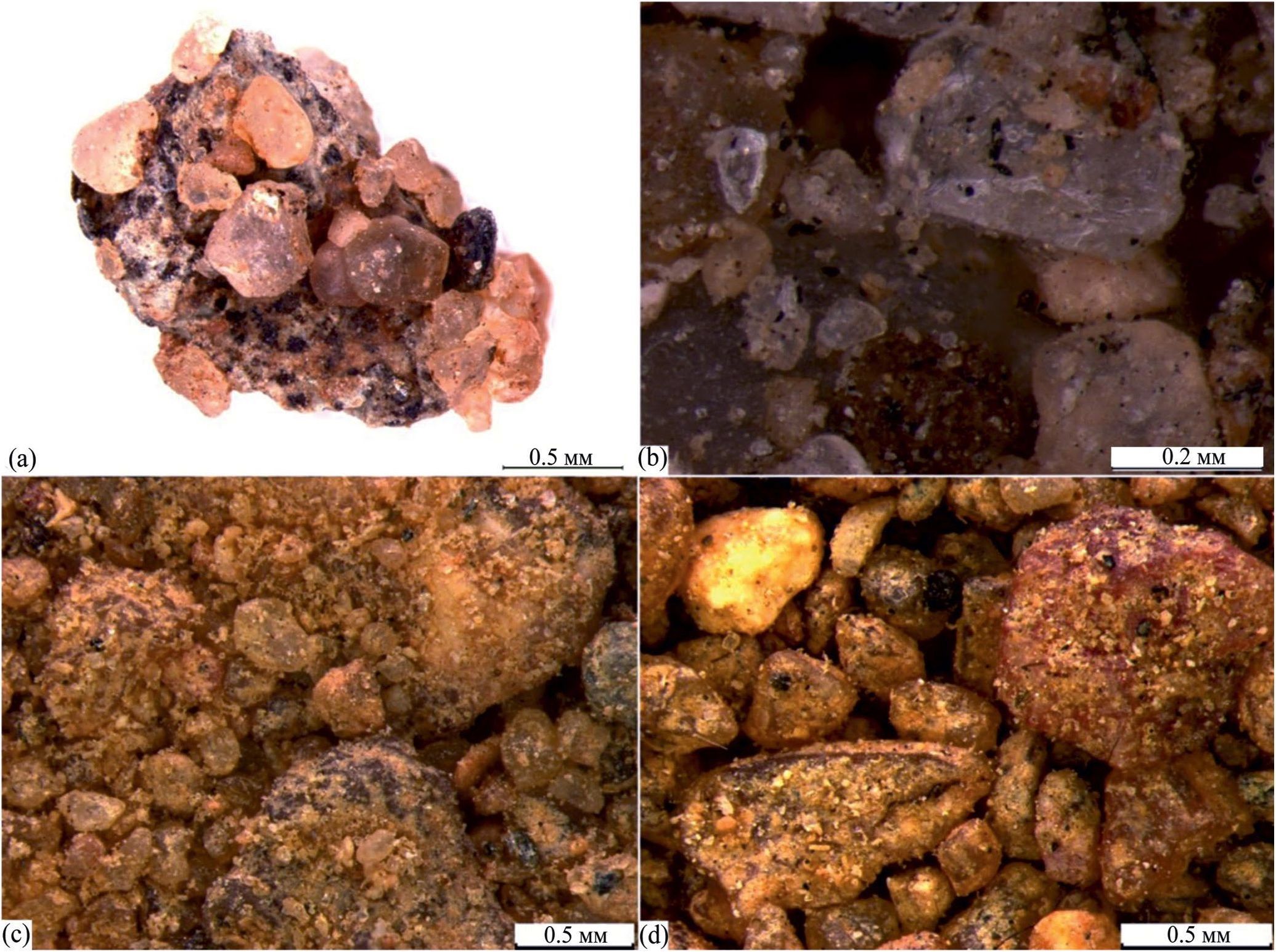 Рис. 3. Минеральный микроагрегат с железистой цементацией из горизонта BCf погребенной почвы кургана 1 (a). Частицы пирогенного угля и пятна ожелезнения на кварцевых зернах в гумусовом горизонте погребенной почвы кургана 1 (b). Скопления пылеватого материала в горизонте BF погребенной почвы кургана 7 (c). Скопления пылеватого материала в горизонте BHF фоновой почвы кургана 7 (d).