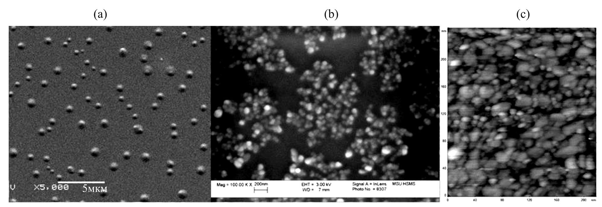 Рис. 1. Снимки выделенных из чернозема выщелоченного надмолекулярных образований, полученные при помощи растрового электронного микроскопа (a, b) и сканирующего туннельного микроскопа (c).