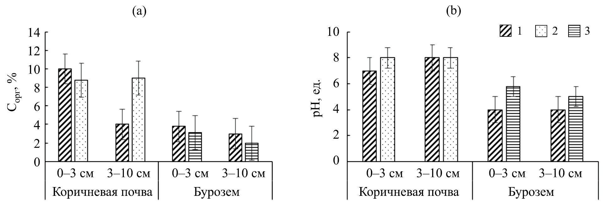 Рис. 3. Содержание органического углерода (а) и рН (b) коричневых почв и бурозема из слоев 0–3 и 3–10 см: 1 – контроль, 2 – постпирогенная коричневая почва, 3 – постпирогенный бурозем.
