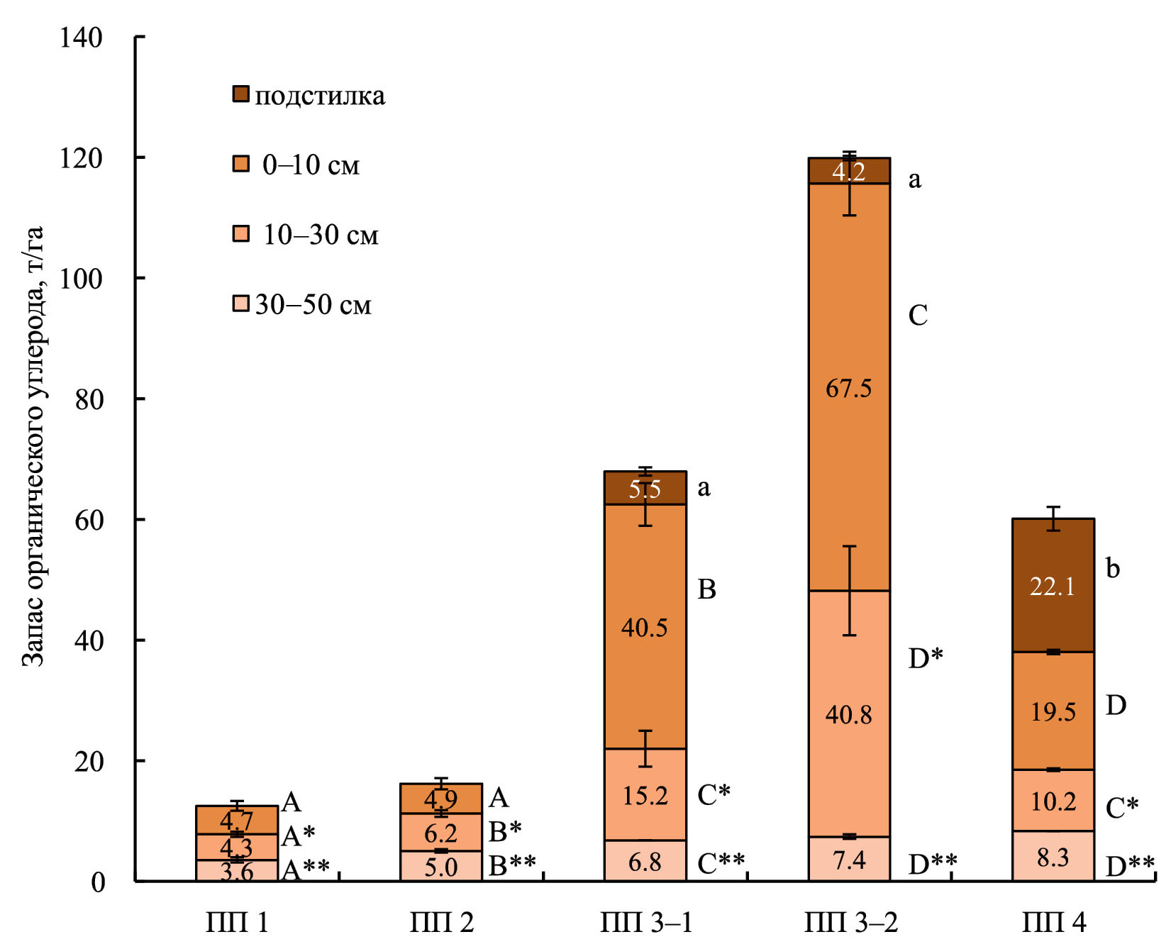 Рис. 2. Запасы углерода (SOCstock) посттехногенных (ПП 1, ПП 2, ПП 3-1, ПП 3-2) и природных почв (ПП 4) среднетаежной подзоны Карелии. Различные буквы указывают на значимые различия средних (р < 0.05) при сравнении каждого горизонта между ПП (a, b – для слоя лесной подстилки; A, B, C, D – для слоя 0–10 см; A*, B*, C* – для слоя 10–30 см; A**, B**, C**, D** – для слоя 30–50 см).