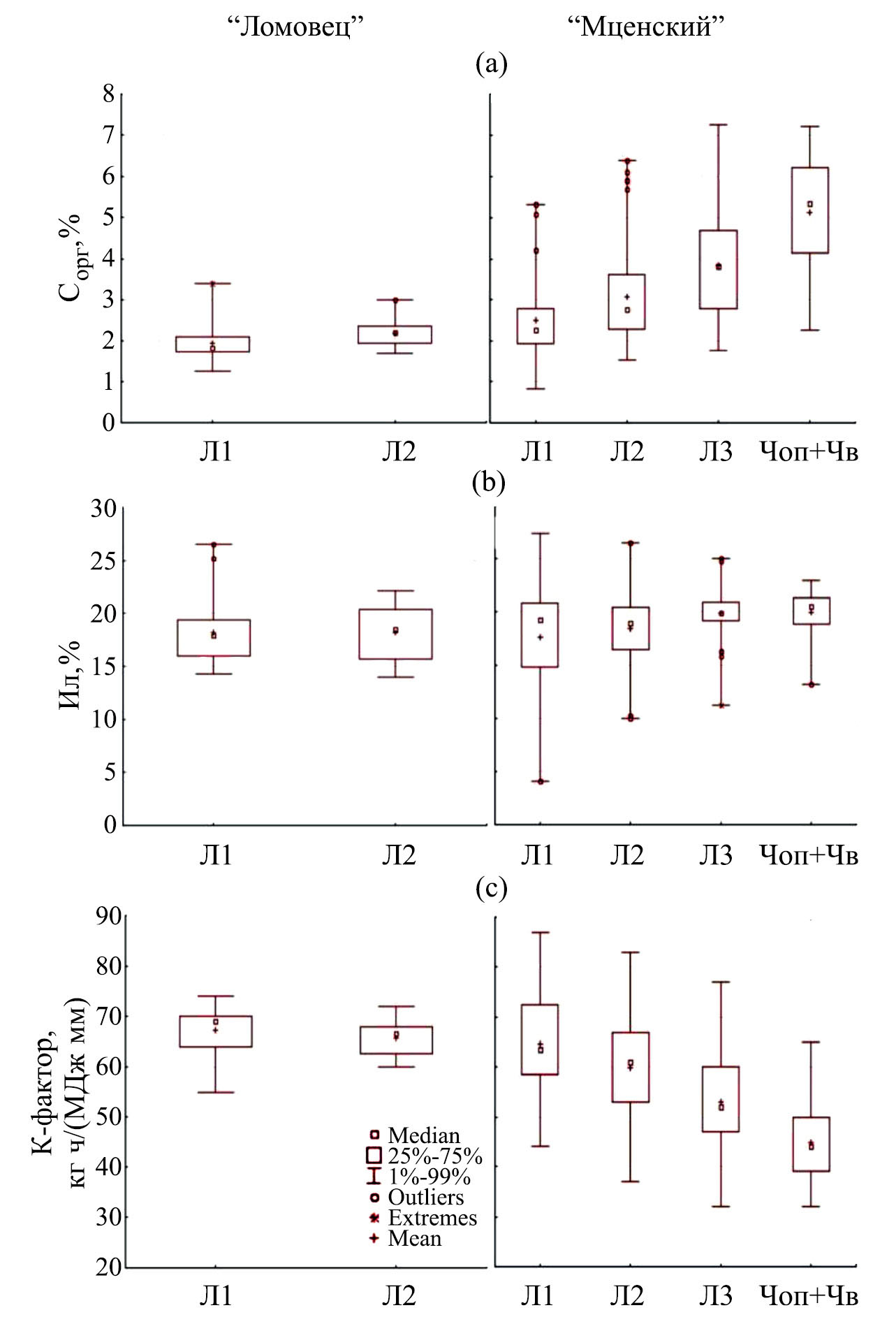 Рис. 2. Варьирование показателей в разных типах почв на участке “Ломовец” и “Мценский”: a – содержание органического вещества (%); b – количество илистой фракций (<0.002 мм, %); c – К-фактор (кг ч/(МДж мм).