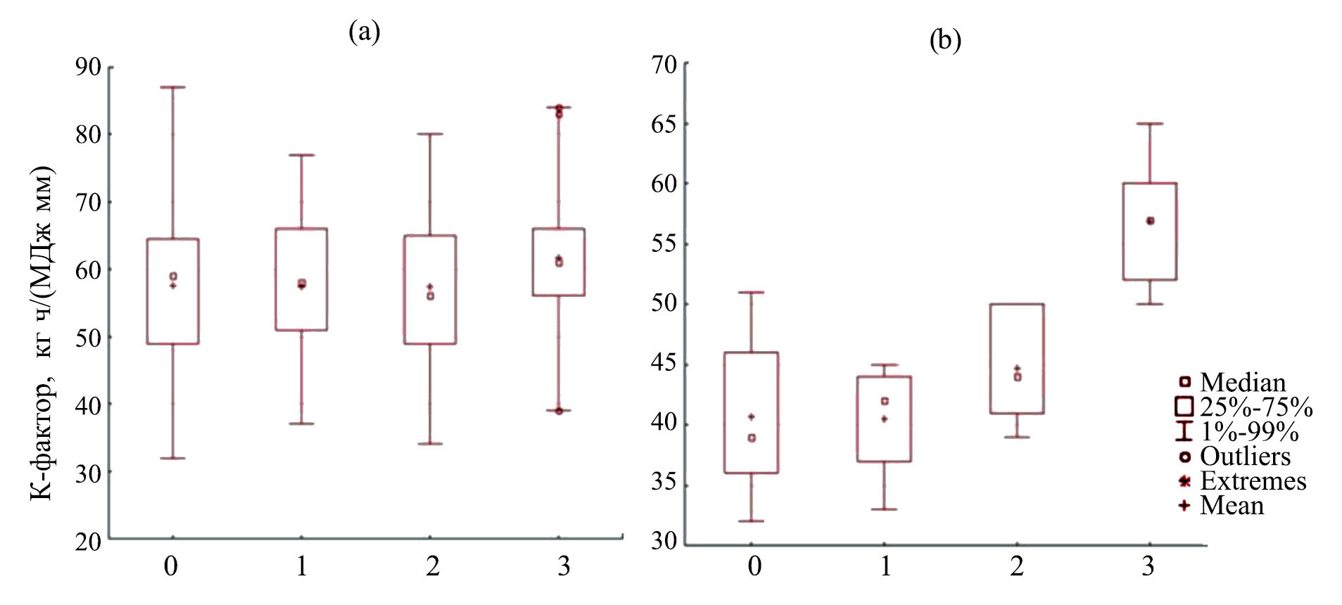 Рис. 3. Параметры варьирования К-фактора на участке “Мценский” в серых лесных почвах (a) и черноземах (b) разной степени эродированности: 0 – несмытые, 1 – слабосмытые, 2 – среднесмытые, 3 –сильносмытые.