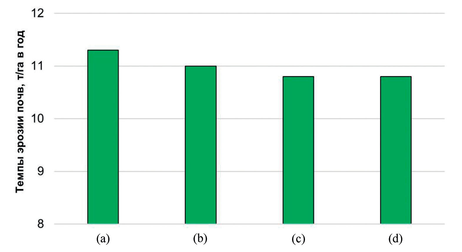 Для определения влияния вариабельности эродируемости почв на моделируемые темпы эрозионно-аккумулятивных процессов были рассчитаны среднемноголетние темпы ливневой эрозии с помощью модели WaTEM/SEDEM [44–46]. Использовали одинаковые входные параметры за исключением эродируемости. R-фактор (эрозионный индекс осадков) принят равным 320 МДж мм/(м² ч год), согласно [39]. С-фактор (фактор растительности и севооборота, характеризующий почвозащитную роль возделываемых культур относительно чистого пара) принят равным 0.40, согласно данным по долевому участию культур в составе севооборота и агроэрозионному индексу культур в данной зоне по Ларионову [13]. LS-фактор (фактор длины и крутизны склона) рассчитывали в программе WaTEM/SEDEM автоматически на основе цифровой модели рельефа и уравнений [36]. Цифровая модель рельефа была получена в результате съемки БПЛА и приведена к рекомендуемому для расчета по модели размеру ячейки 20 × 20 м.