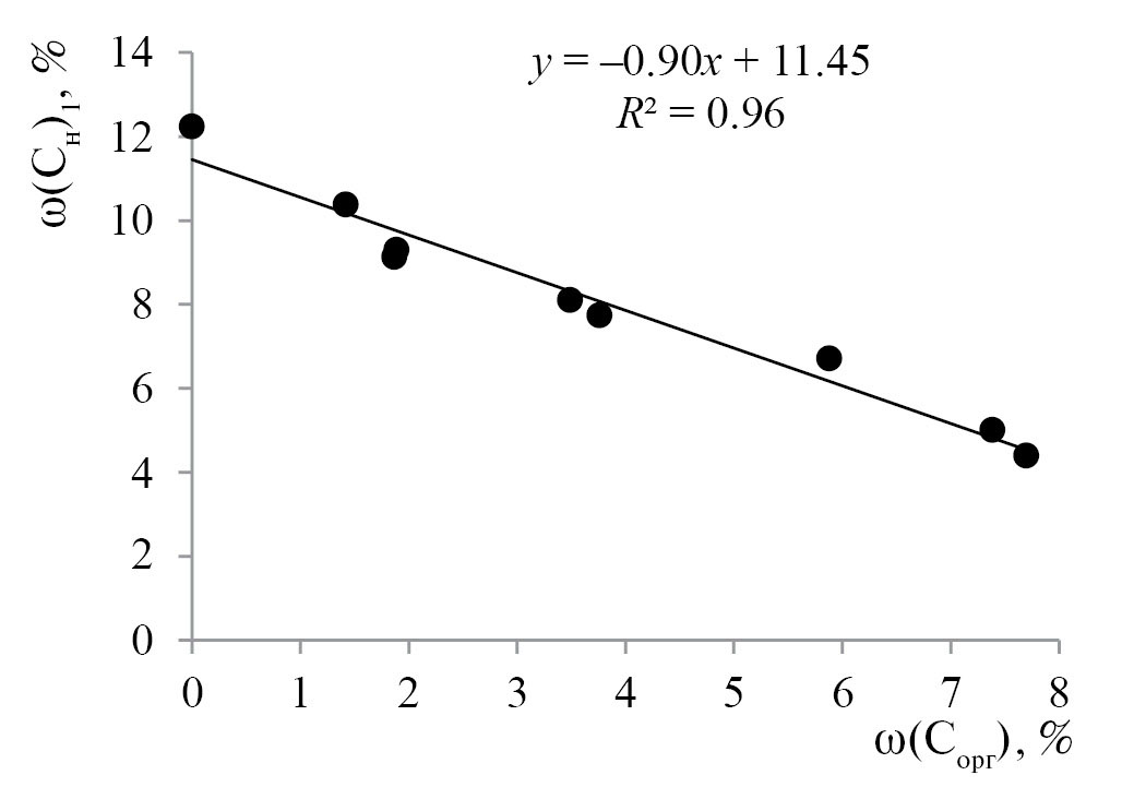 Углерод непрерывно циркулирует в биосфере Земли под влиянием химических, физических и биологических процессов. Две формы углерода тесно взаимосвязаны [88, 96]. С одной стороны, карбонаты замедляют круговорот органического углерода, стабилизируя Сорг путем физической защиты (окклюзии) от деградации [64]. С другой, органические кислоты, образующиеся в результате функционирования биоты [5], растворяют карбонаты. Углерод в виде углекислого газа, образовавшегося в ходе реакции, удаляется из системы [7, 8, 58, 60, 80, 109]. Подтверждением течения этих процессов выступает тесная взаимосвязь между содержанием Сорг и Сн (r = –0.983, p < 0.000, n = 9 [6]), характеризующая почвы Полярного Урала (хребет Большой Пайпудынский) (рис. 1).