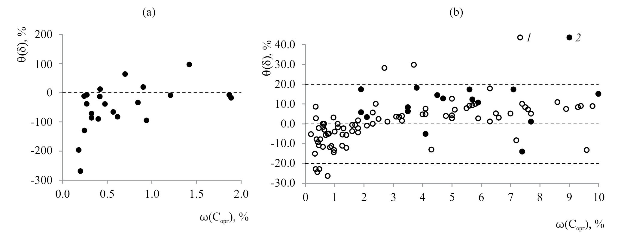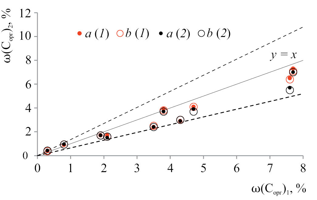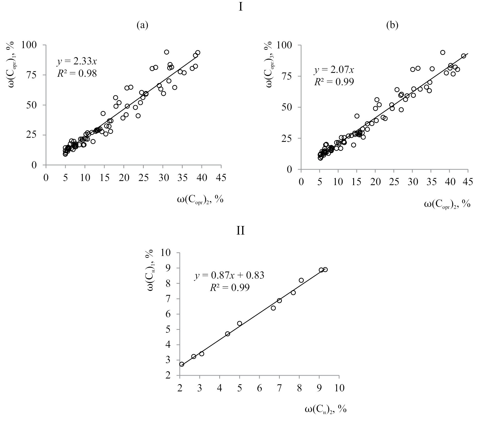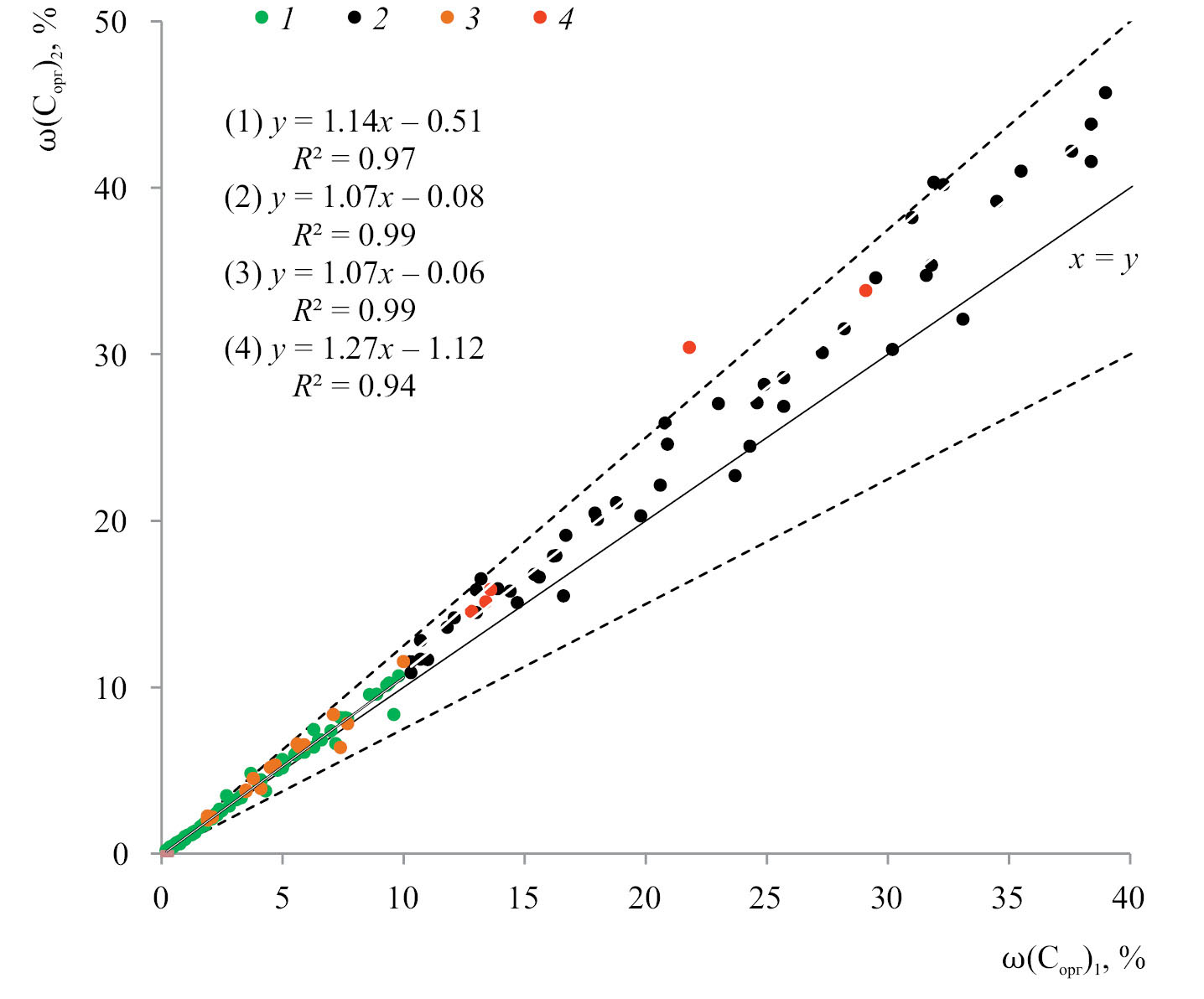 Неравномерная оснащенность химических лабораторий ограничивает сравнение результатов измерений содержания Сорг, полученных альтернативными методами. Проблемы проведения долгосрочного мониторинга отдельных территорий вызывает также смена/развитие аналитических методов исследований [49, 50]. Однако использование различных способов – далеко не единственная причина расхождения результатов измерений [67].