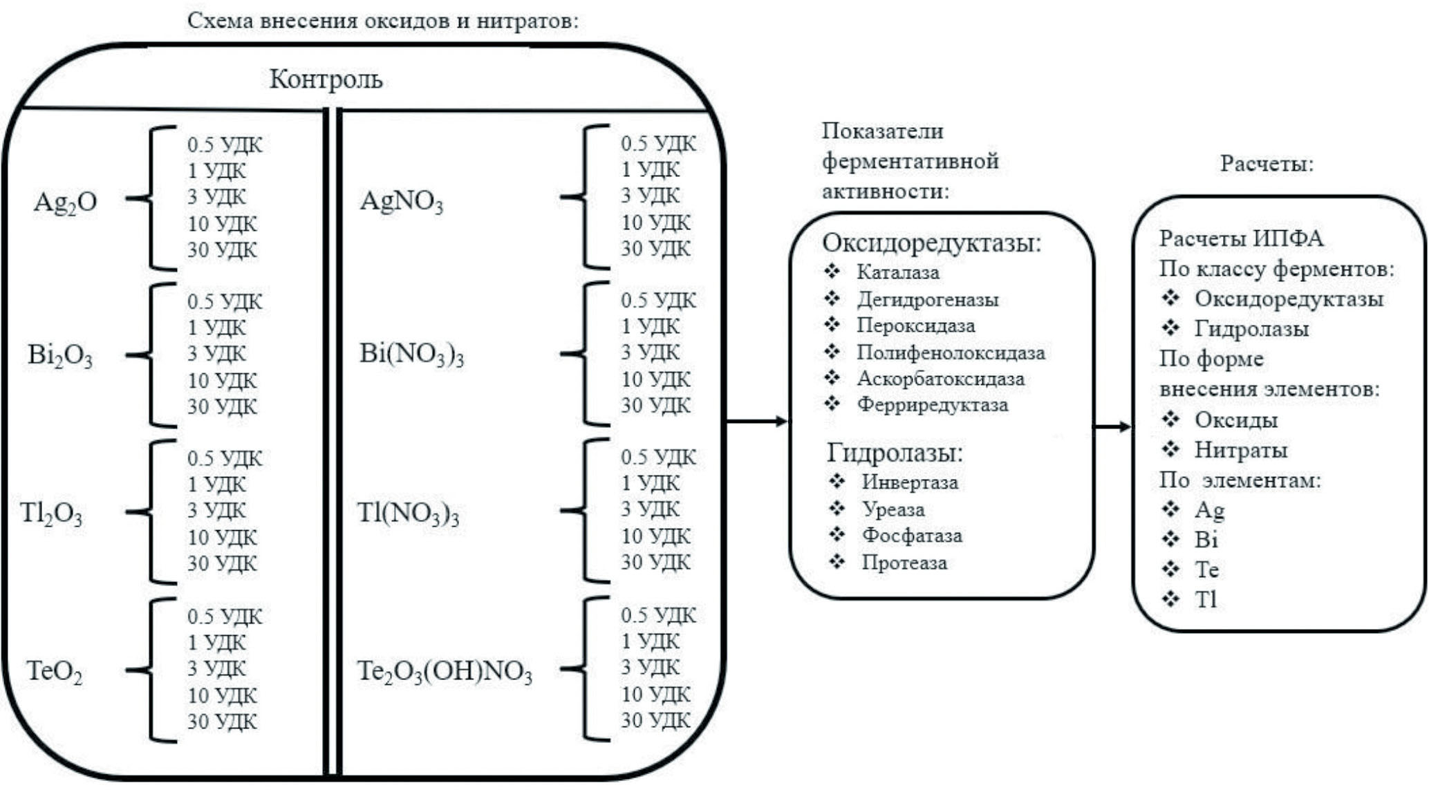 Методы оценки ферментативной активности. Для оценки экологического состояния почв после внесения Ag, Bi, Tl и Te анализировали активность 10 ферментов: 6 ферментов класса оксидоредуктазы (каталазы, дегидрогеназы, пероксидазы, полифенолоксидазы, аскорбатоксидазы, ферриредуктазы) и 4 фермента класса гидролазы (протеазы, фосфатазы, инвертазы и уреазы) (табл. 2). Именно эти два класса ферментов играют основную роль в биологическом круговороте веществ в почве [12].