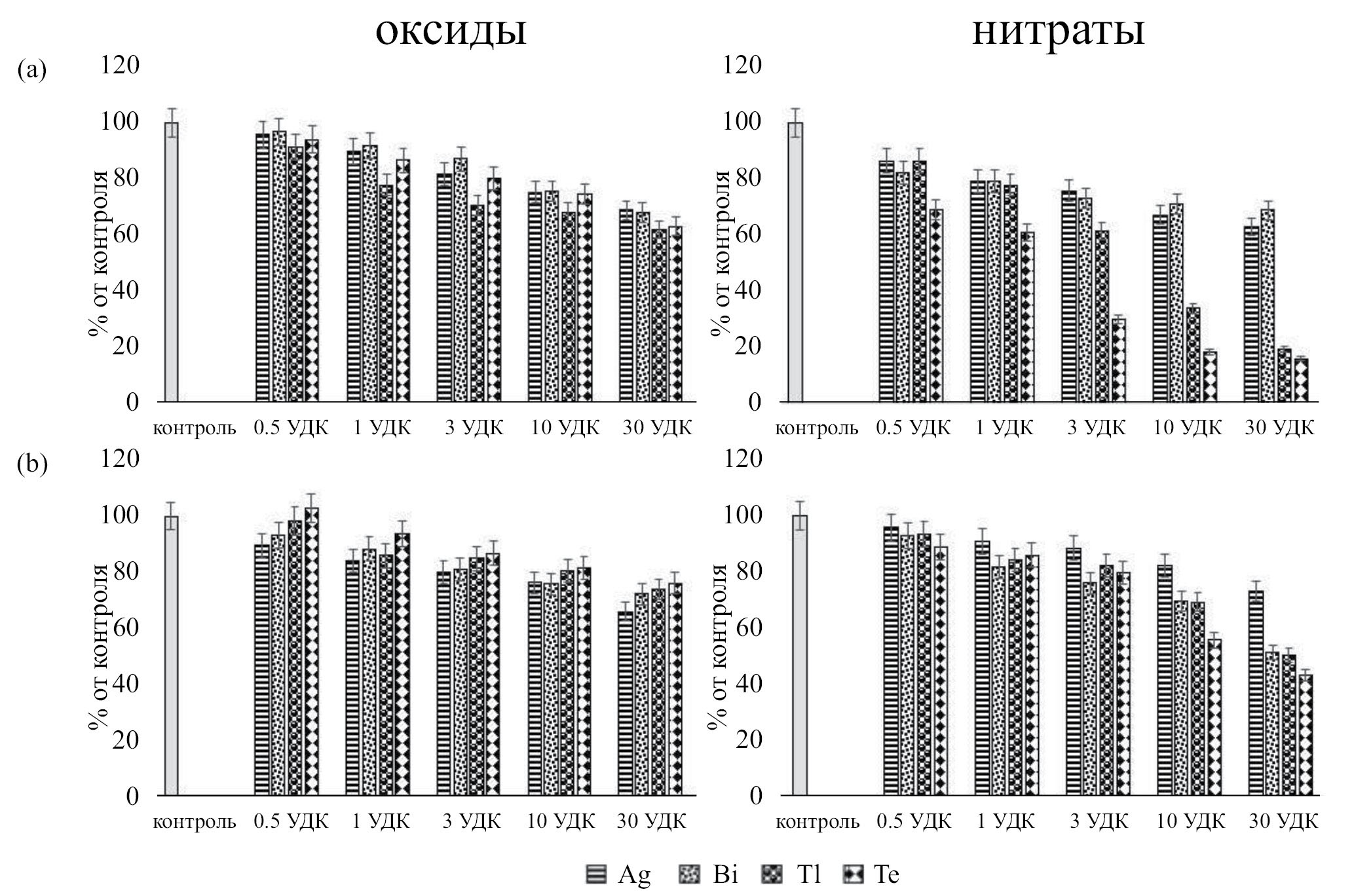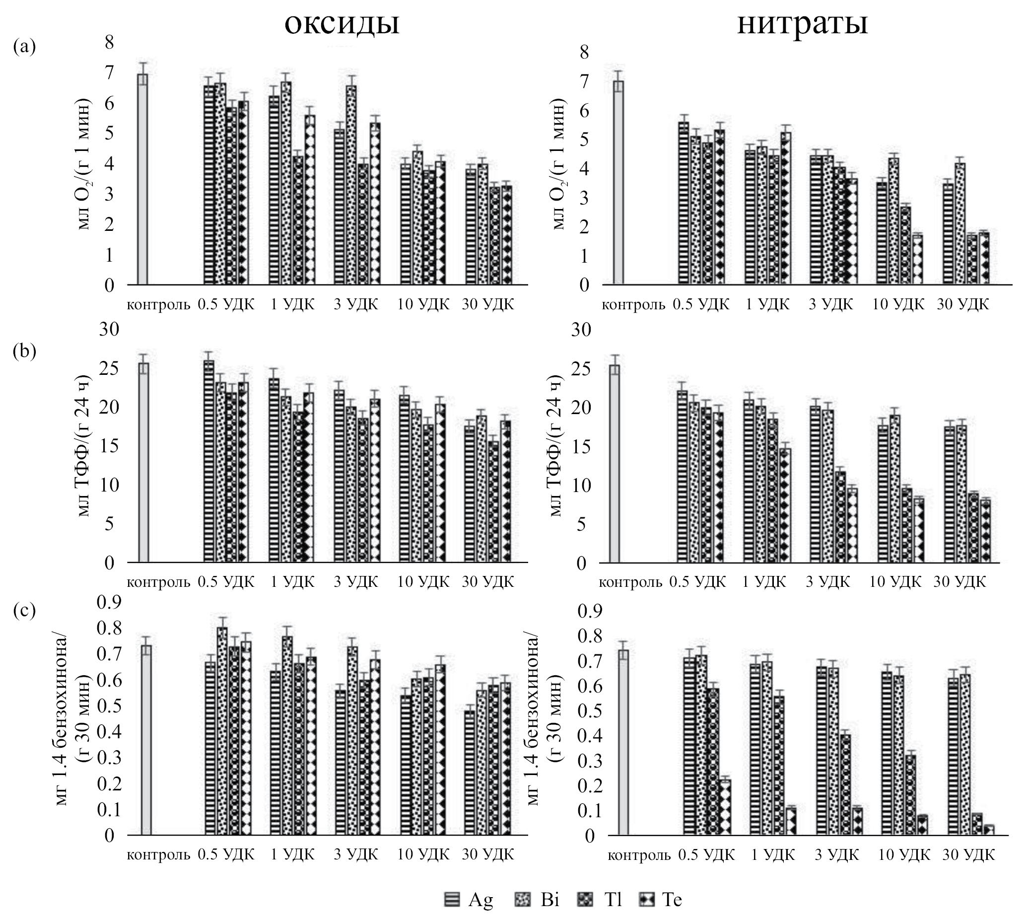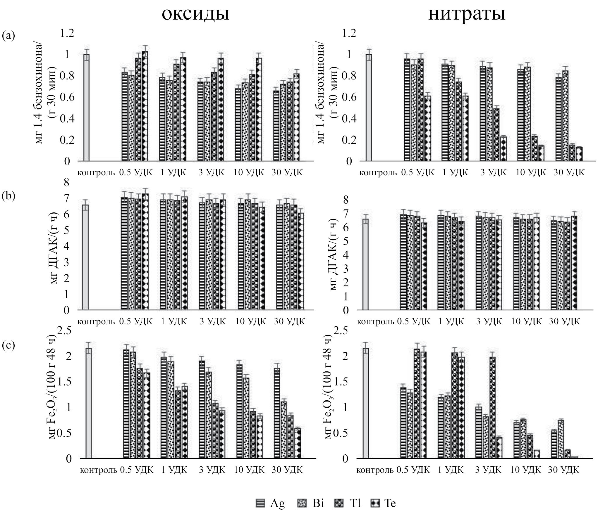 Активность пероксидазы и полифенолоксидазы при загрязнении чернозема обыкновенного оксидами и нитратами Ag, Bi, Tl и Te представлена на рис. 2c, 3a. Серебро в форме оксида 0.5 УДК не оказывает влияния на активность пероксидазы. При повышении концентрации от 1 до 30 УДК установлено снижение активности фермента на 7–29% относительно контроля. Нитрат серебра при дозах 0.5, 1 и 3 УДК достоверно не отличался от контроля и только при дозе 10 и 30 УДК активность пероксидазы снизилась на 5 и 8% соответственно.