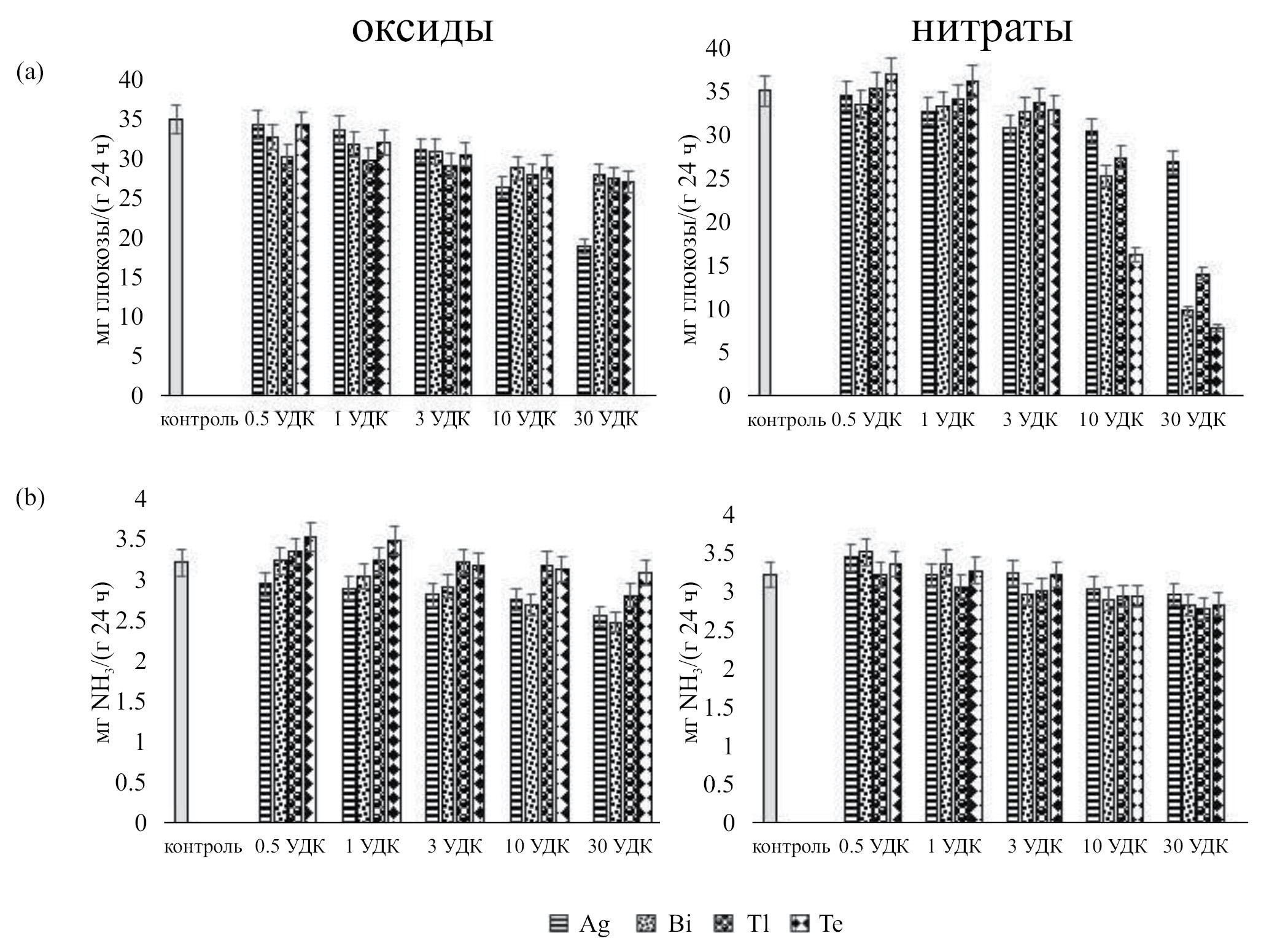 Оксид теллура в дозах от 1 до 30 УДК ингибировал активность инвертазы на 9–23% относительно контроля. Нитрат теллура при дозах 0.5, 1 и 3 УДК не оказывали достоверного воздействия на активность фермента, а при повышении концентрации нитрата теллура до 10 и 30 УДК на 54 и 78% относительно контроля.