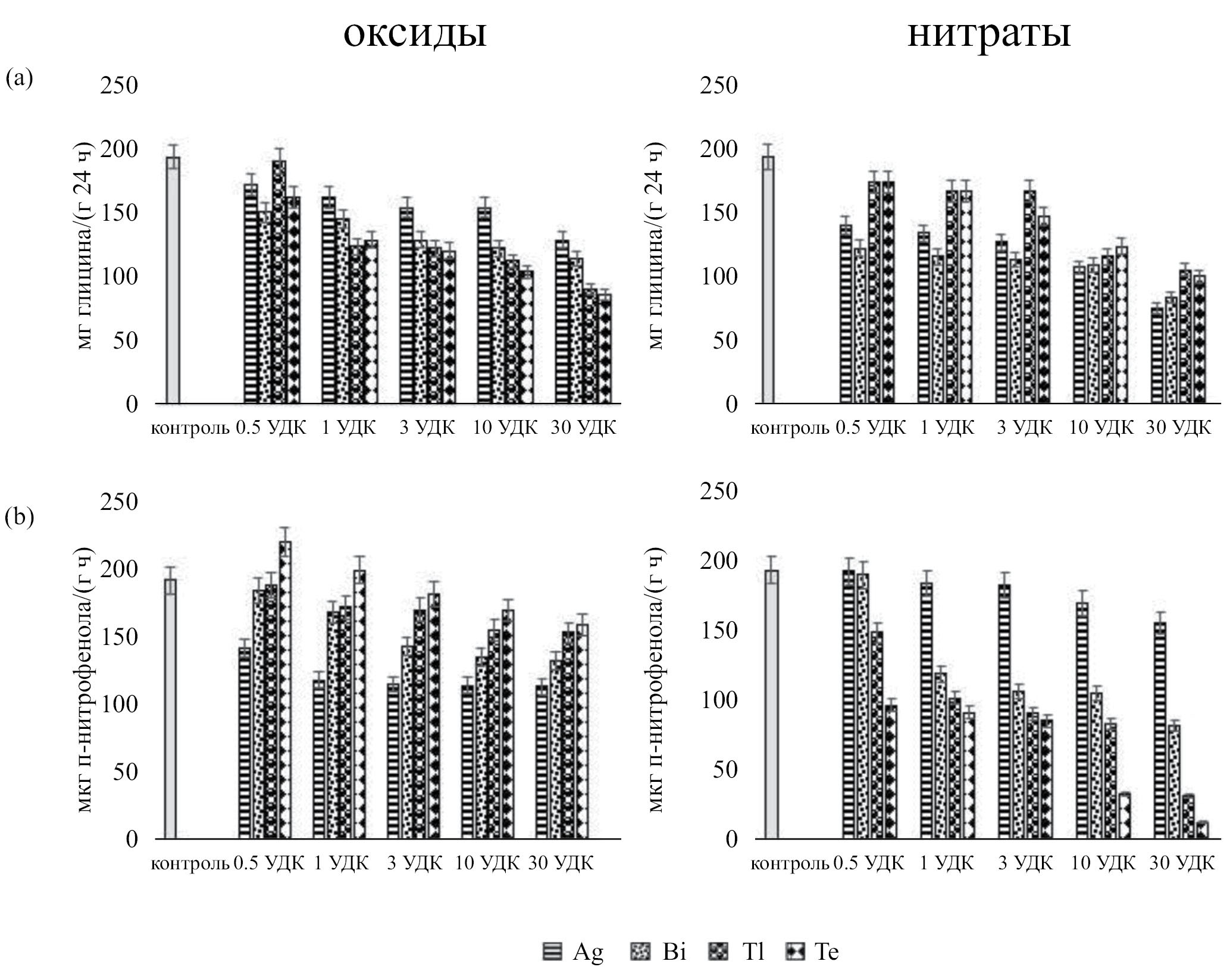 Рис. 5. Изменение активности ферментов класса гидролазы при загрязнении чернозема обыкновенного оксидами и нитратами Ag, Bi, Tl и Te: a – протеаза (мг глицина/(г 24 ч)); b – фосфатаза (мкг п-нитрофенола/(г ч)).