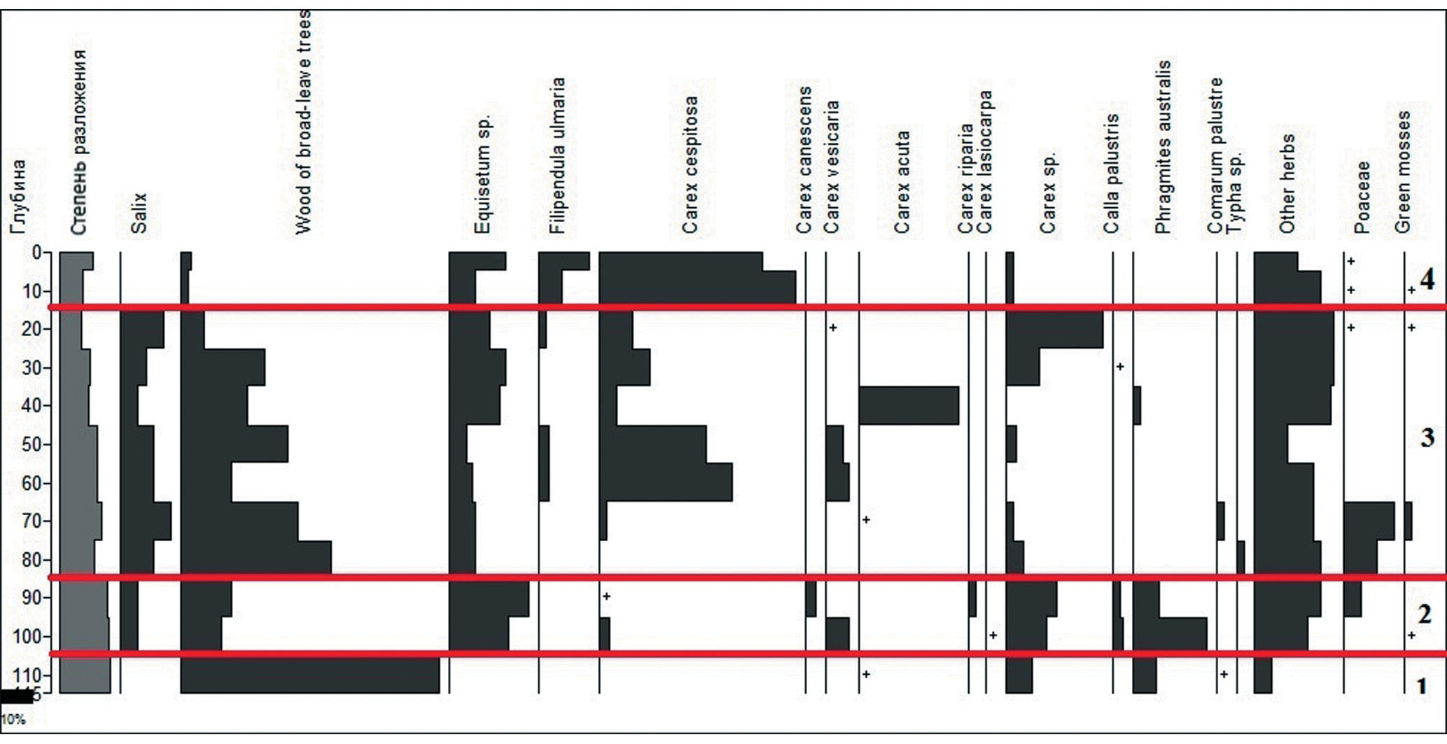 Болото Подкосьмово, образовавшееся в суббореальный период голоцена [12, 45], в процессе развития характеризовалось последовательной сменой эвтрофных древесного (с участием Salix sp.), древесно-травяных (Phragmites australis, Carex sp., Equsetum sp., Poaceae, др.) и осокового (Carex cespitosa, C. acuta) палеоценозов (рис. 2). Это означает, что гидрологический режим болотного биотопа менялся незначительно. Так, слабое обводнение и высокая аэрация способствовали не только поселению древесных пород на начальных стадиях генезиса болота, но и активной трансформации отмерших растительных остатков, что способствовало формированию торфов с высокой степенью разложения (до 70%). По мере накопления торфа сезонная амплитуда УБВ снижалась, древесные породы выпадали из состава палеорастительности, начинали доминировать влаголюбивые травы. Кроме того, степень разложения торфов в таких условиях становилась ниже и в среднем по профилю залежи составляет 40–50%. Интенсивность торфообразовательного процесса в ходе развития болота изменялась от 0.16 до 0.5 мм/год.