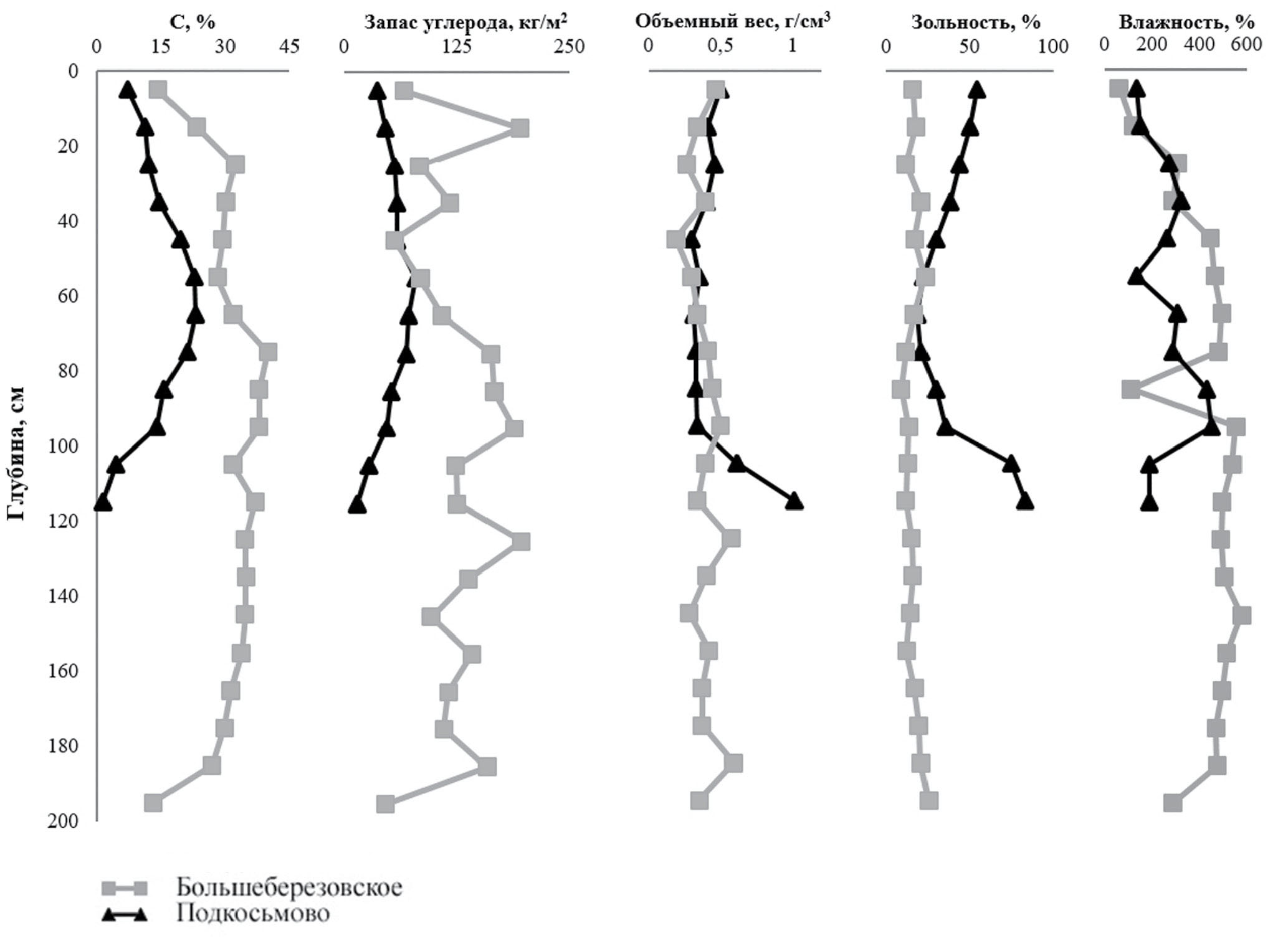 Исходя из содержания, рассчитан запас углерода в торфяных залежах болот. В каждом 10 см слое торфяной залежи Большеберезовского болота запас углерода составляет в среднем 125 кг С/м2. Максимальные значения (118.5–210.8 кг С/м2) свойственны торфам с древесными остатками, залегающими на глубине 90–100 и 120–130 см, которые образовались в суббореальном периоде голоцена. В это время интенсивность аккумуляции углерода тростниковыми палеосообществами болота достигала 208 г/м2 в год (от 109.4 до 379.4 г/м2 в год), что обусловлено увеличением скорости торфообразовательного процесса до 1.8 мм/год. На начальных этапах развития болота скорость аккумуляции углерода составляла 13.7 г/м2 в год, впоследствии увеличиваясь в атлантический период до 42.5 г/м2 в год. В субатлантическом периоде показатель снизился до 7–20 г/м2 в год, однако это является следствием мелиоративных мероприятий, усиливших процессы трансформации торфа в верхних горизонтах торфяной залежи. Общий запас органического углерода на 1 м2 залежи Большеберезовского болота составляет 2499 кг.