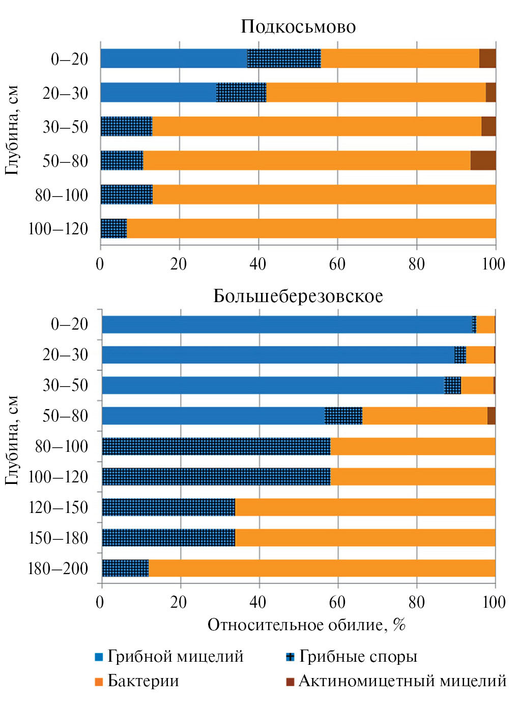 Различались болота не только профильным распределением микробной биомассы, но и ее структурой. Так, в большей части профиля торфяной залежи болота Подкосьмово в микробной биомассе преобладала бактериальная составляющая (58–93%), тогда как в болоте Большеберезовское – грибная (58–95%) (рис. 6).