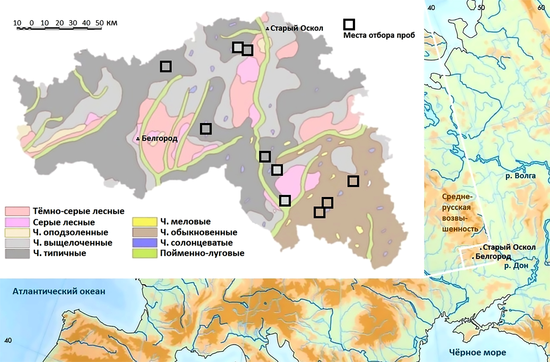 Отбор образцов почвы. Исследование проводили на территории Белгородской области России, в южной части Среднерусской возвышенности, в бассейнах рек Оскол и Северский Донец, входящих в речную систему Дона (рис. 1). Белгородская область расположена в зоне лесостепи на приподнятой равнине с выраженными эрозионными явлениями, высота над уровнем моря составляет в среднем 200 м. Среднегодовая температура воздуха в различных точках региона варьирует в пределах 5.4–6.8°С. Январь является самым холодным месяцем, безморозный период продолжается в течение 155–160 дней, продолжительность солнечного сияния – 1800 ч/год. Зимой почва промерзает на 0.5–1.0 м. В различных районах области годовое количество осадков варьирует от 540–550 до 400 мм. Лесистость области составляет 9.8% [1]. Зональные почвы представлены различными подтипами черноземов, занимающими 77% территории, и серыми лесными почвами (15% территории) [2].