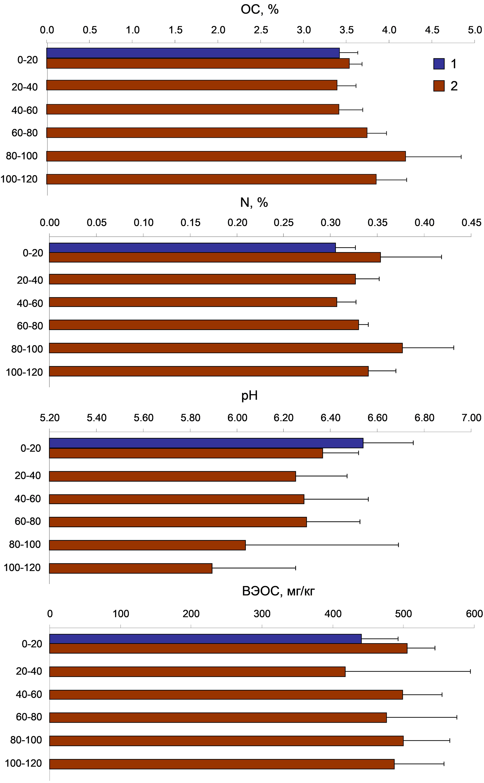 Содержание в почвенных образцах органического углерода, азота, величина рН водной вытяжки, количество растворенного органического углерода и азота, извлекаемых водной вытяжкой 1 : 5 (ВЭОС и ВЭN соответственно) в 20-сантиметровых слоях с поверхности до глубины 120 см показаны на рис. 2. Кроме того, приведены средние значения для верхнего слоя 0–20 см пахотных черноземов, обследованных в трех точках: на приводораздельном участке, в средней части склона северной экспозиции и в днище распахиваемой ложбины в нижней части склона северной экспозиции.