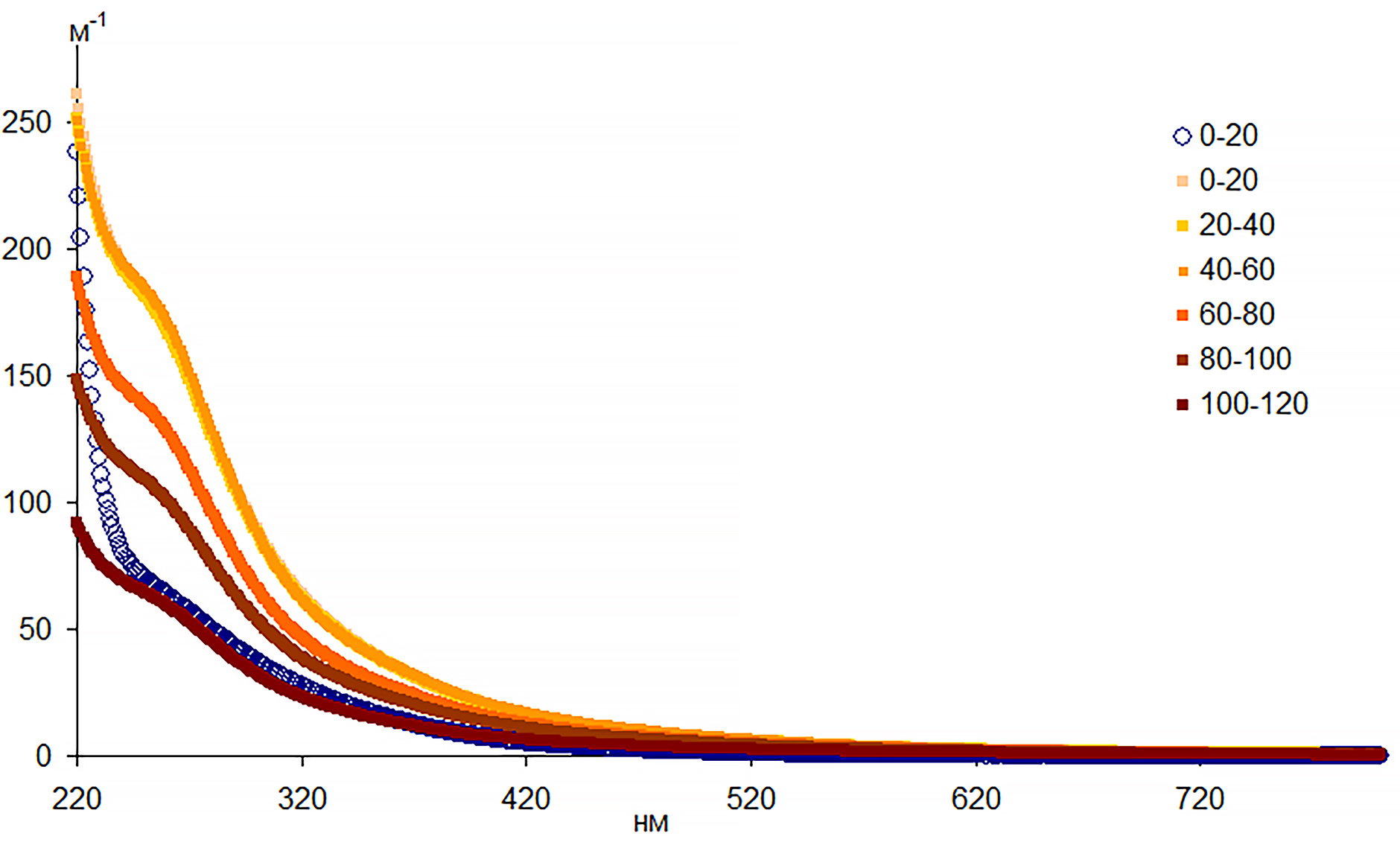4. Fig. 3. Averaged absorption spectra of soil EEOC: filled symbols – layers of stratosols at the bottom of the ravine every 20 cm from 120 cm to 120 cm; unfilled symbols – for the layer 120–20 cm above the arable chernozems.