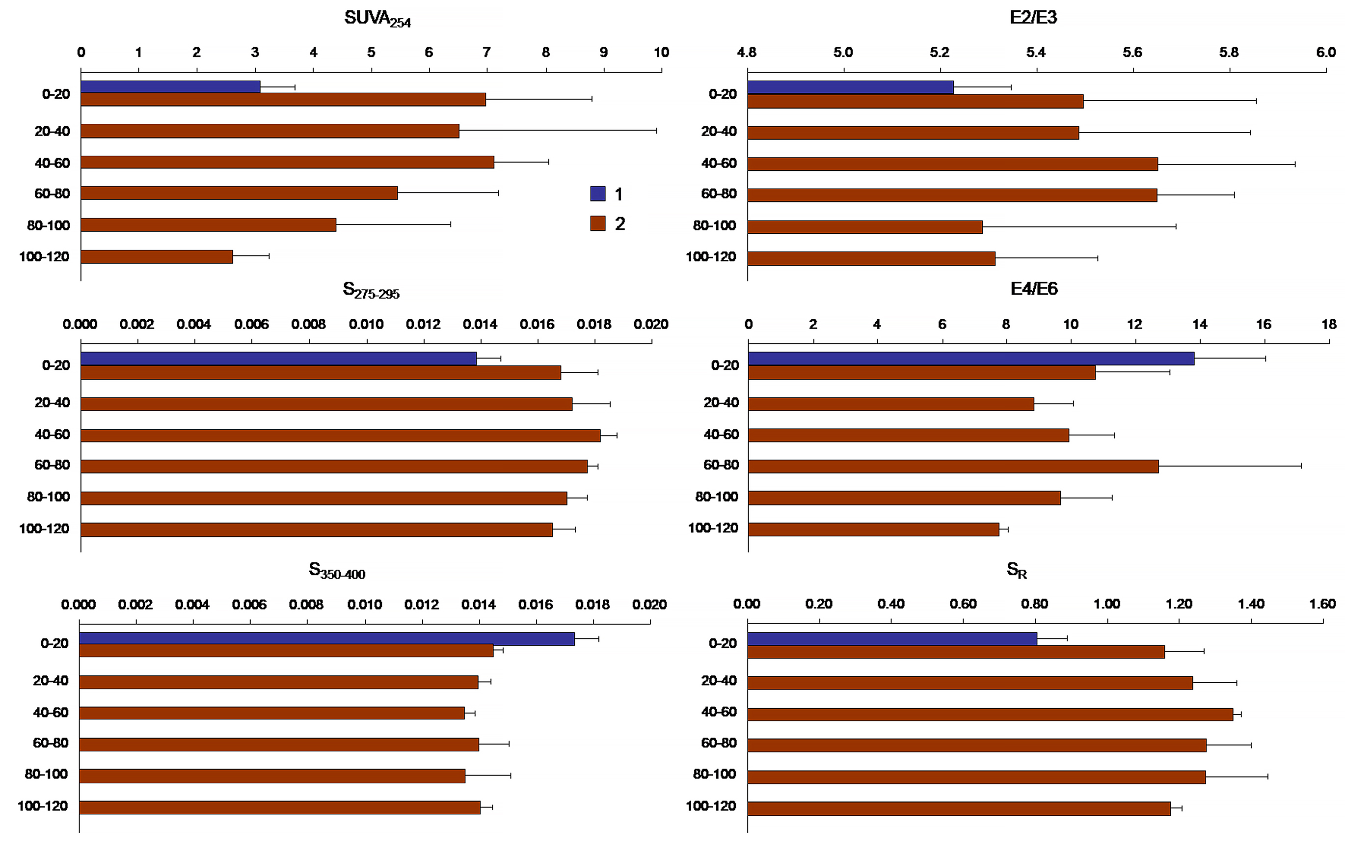 5. Fig. 4. Indicators of the absorption spectra of SUVA254, E2/E3, E4/E6, S275–295, S350–400 and SR of the VEOV in soil layers: 1 – average indicators of the layer ٠– 2٠ cm above the arable chernozems; 2 – stratozems of the ravine bottom.