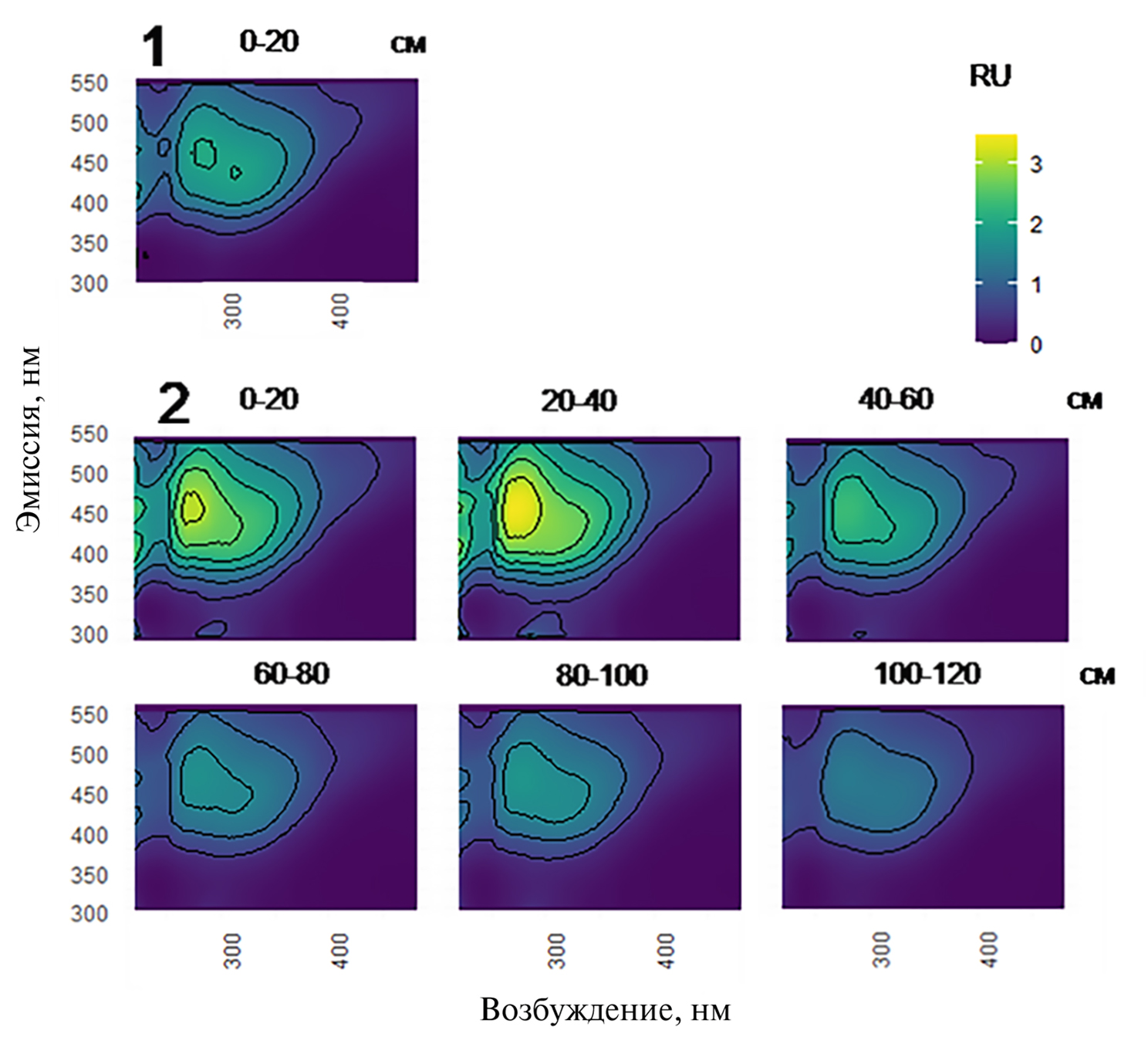 6. Fig. 5. Typical three-dimensional fluorescence spectra of VEOV in soil layers (1–12 cm): 1 – arable chernozems; 2 – stratozems of the ravine.