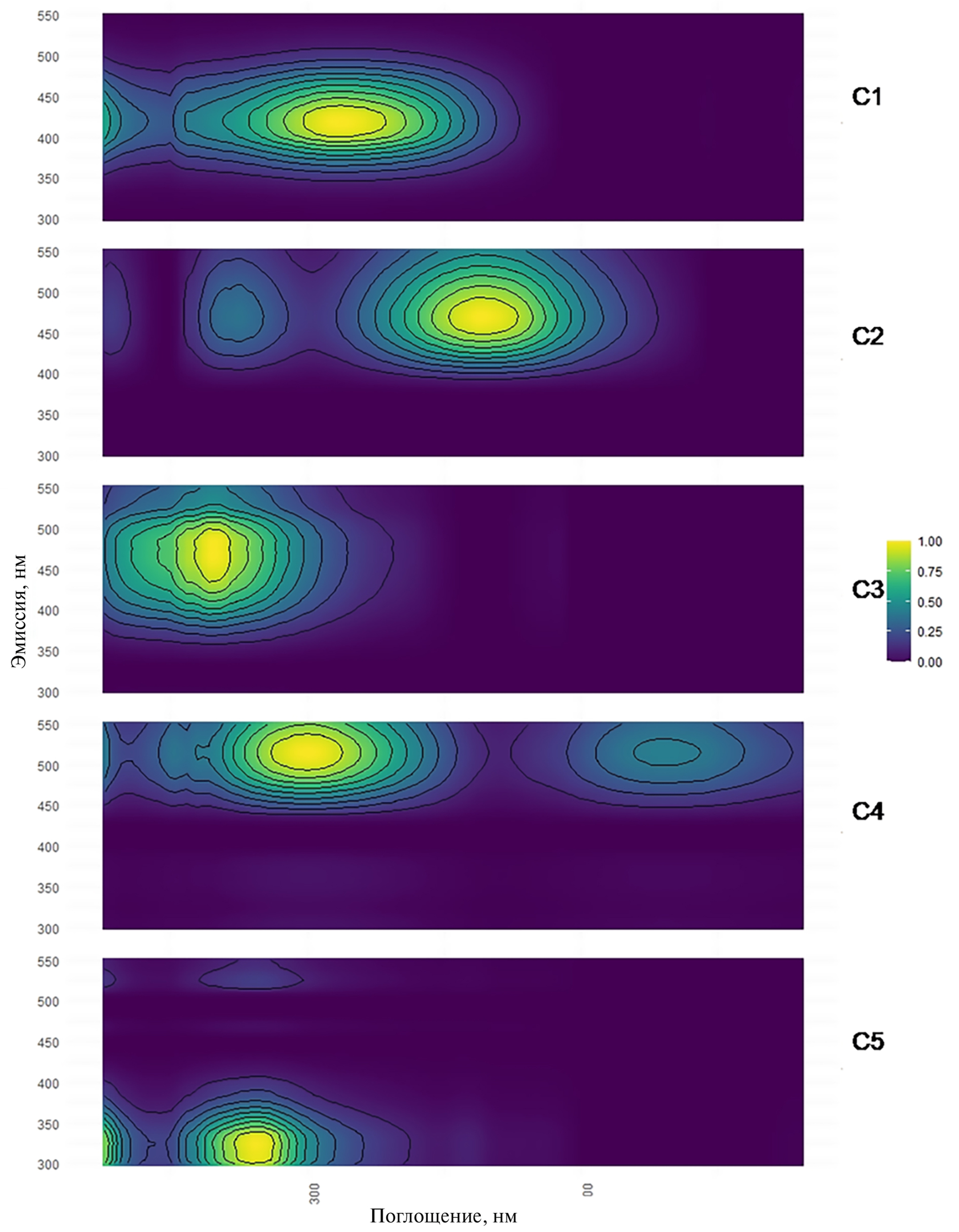 Рис. 6. Компоненты С1–С5 см. табл. 1, полученные разложением флуоресцентных 3D-спектров ВЭОВ с помощью PARAFAC. Каждая компонента в RU нормирована на свой максимум интенсивности.