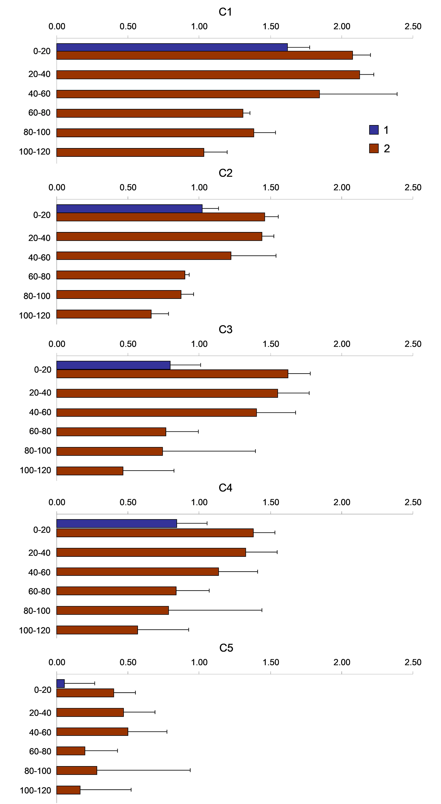 Рис. 7. Величины флуоресцирующих компонентов С 1–С 5 см. табл. 1 (RU) ВЭОВ в слоях почв: 1 – средние показатели слоя ٠– 2٠ см выше расположенных пахотных черноземов; 2 – стратоземы дна балки.