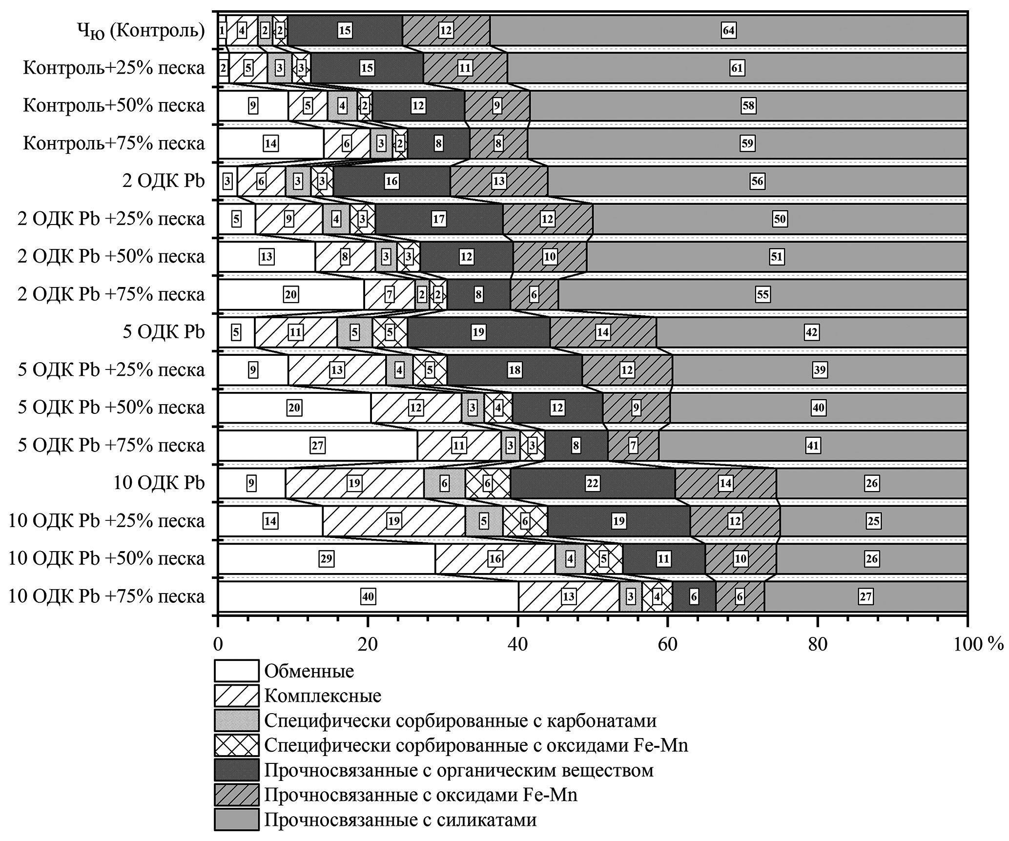 Наибольшие изменения фракционного состава Pb наблюдаются при внесении 10 ОДК металла в почвенно-песчаный субстрат. В вариантах с 25, 50 и 75% песка отмечается соответствующее снижение градации буферности до средней, низкой и очень низкой и повышение подвижности Pb за счет обменных и комплексных соединений металла. Эти изменения отражаются на последовательности в распределении металла по формам соединений в почве. С облегчением грансостава увеличивается и становится доминирующей доля самых подвижных обменных и комплексных соединений в черноземе южном легкосуглинистом и супесчаном. Наблюдается следующее фракционное распределение металла: обменные > прочносвязанные с силикатами > комплексные > прочносвязанные с органическим веществом > прочносвязанные с оксидами Fe–Mn > специфически сорбированные с оксидами Fe–Mn> специфически сорбированные с карбонатами.