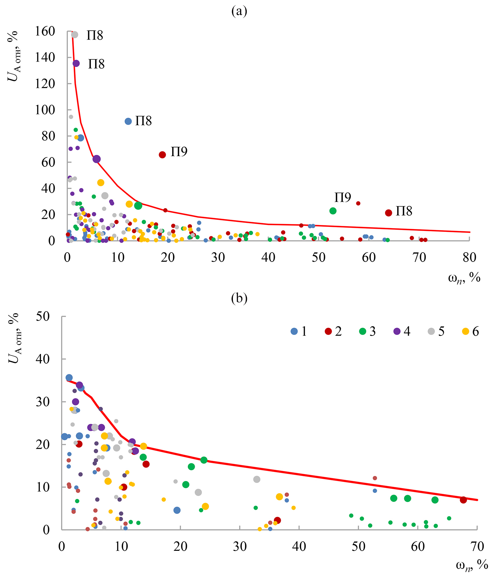 4) для дополнительной оценки показателей прецизионности рассчитывали расширенную неопределенность результатов измерений типа А (UA) по результатам контроля внутрилабораторной воспроизводимости для 39 образцов почв при проведении исследований методом МК, и 16 образцов почв – методом ММК. С этой целью исследовали почвы дважды в условиях воспроизводимости. Первичный (ωn1) и повторный (ωn2) результаты измерения получали в разное время, при разных температурах окружающей среды. Абсолютное расхождение двух измерений обусловлено случайными факторами и характеризуется абсолютной расширенной неопределенностью типа А каждого результата (UAn1 и UAn2):