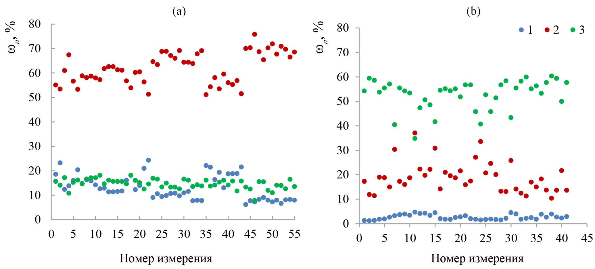 Таким образом, при исследовании навески почвы 25 г использование весов 1 и 2 класса точности равнозначно при высоком содержании ЭЧП, входящих в состав фракций (ωn ≥ 10%). При меньших значениях ωn использование весов 1 класса точности позволяет снизить UВ отн результатов исследований ГС почвы до 20% в первом поддиапазоне массовой доли ЭЧП (ωn от 1 до 5%) (рис. 6c).