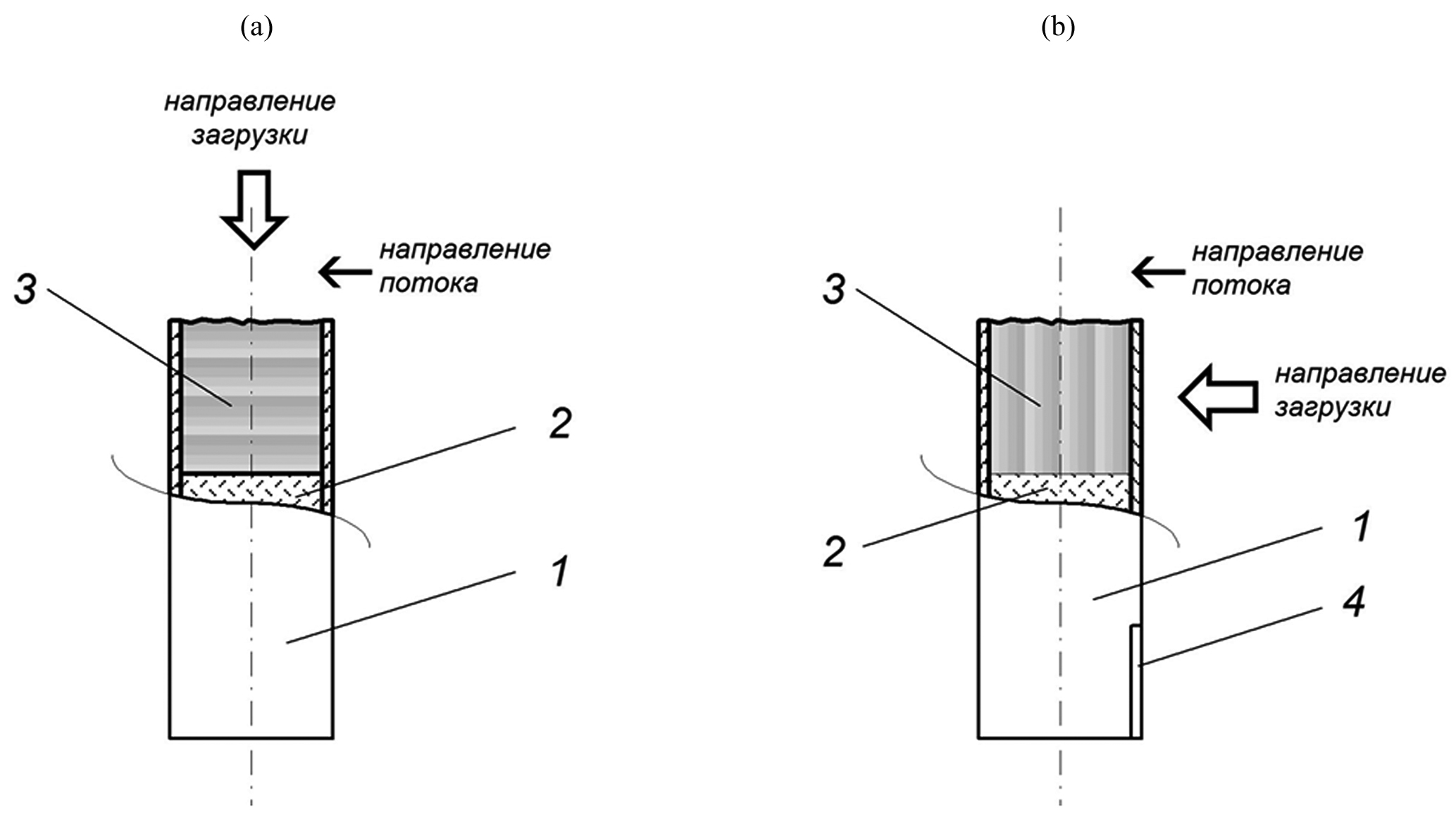 Рис. 4. Схема расположения слоев, сформированных модельных образцов почвы, по отношению к водного потоку при вертикальном (a) и горизонтальном (b) направлениях загрузки: 1 – кассета; 2 – проставка; 3 – слои почвенных агрегатов; 4 – съемная боковая стенка кассеты.