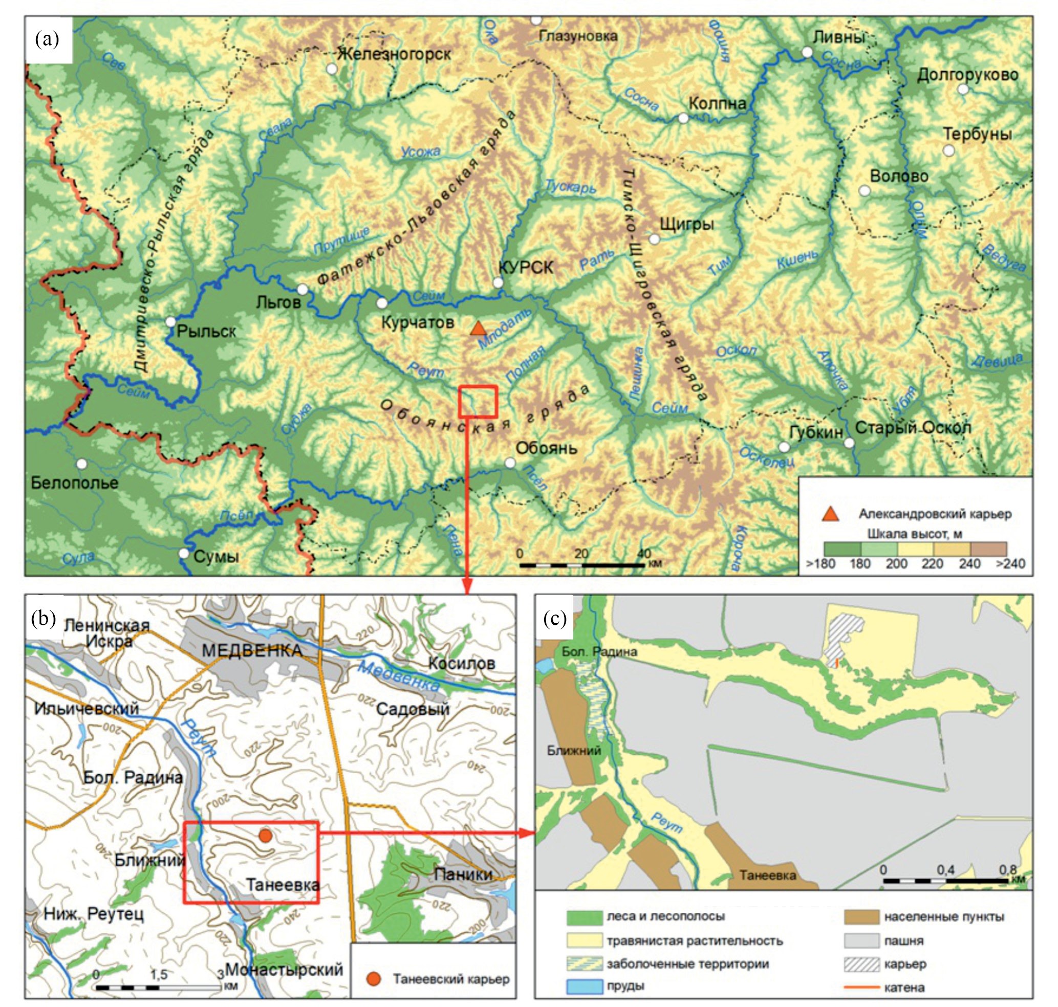 Рис. 1. Расположение Танеевского карьера на карте Курской области (a), рельеф (b), местоположение в ландшафте (c)