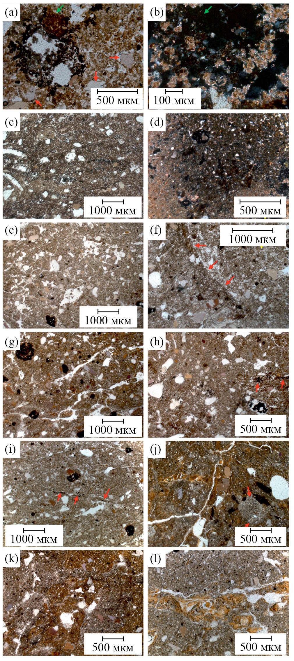 Горизонт ЕВ, 397–420, [42–65] см, оставляет двоякое впечатление. С одной стороны, здесь еще хорошо развиты обесцвеченные микрозоны тонкодисперсной массы, но они часто имеют неестественно ровные границы (рис. 3j, стрелки) и четко видны внедрения более глинистого бурого материала. С другой, есть микрозоны с бурой глиной и приуроченными к ней гумусово-Fe-глинистыми кутанами и пятнами Fe–Mn оксидов (рис. 3j, центр и левая часть). Но и здесь видны микрозоны внедрения материала более крупнозернистого и обезжелезненного, эти фрагменты имеют произвольную форму, материал в целом разбит трещинной сетью, которая сечет как бурые, так и светлые фрагменты.