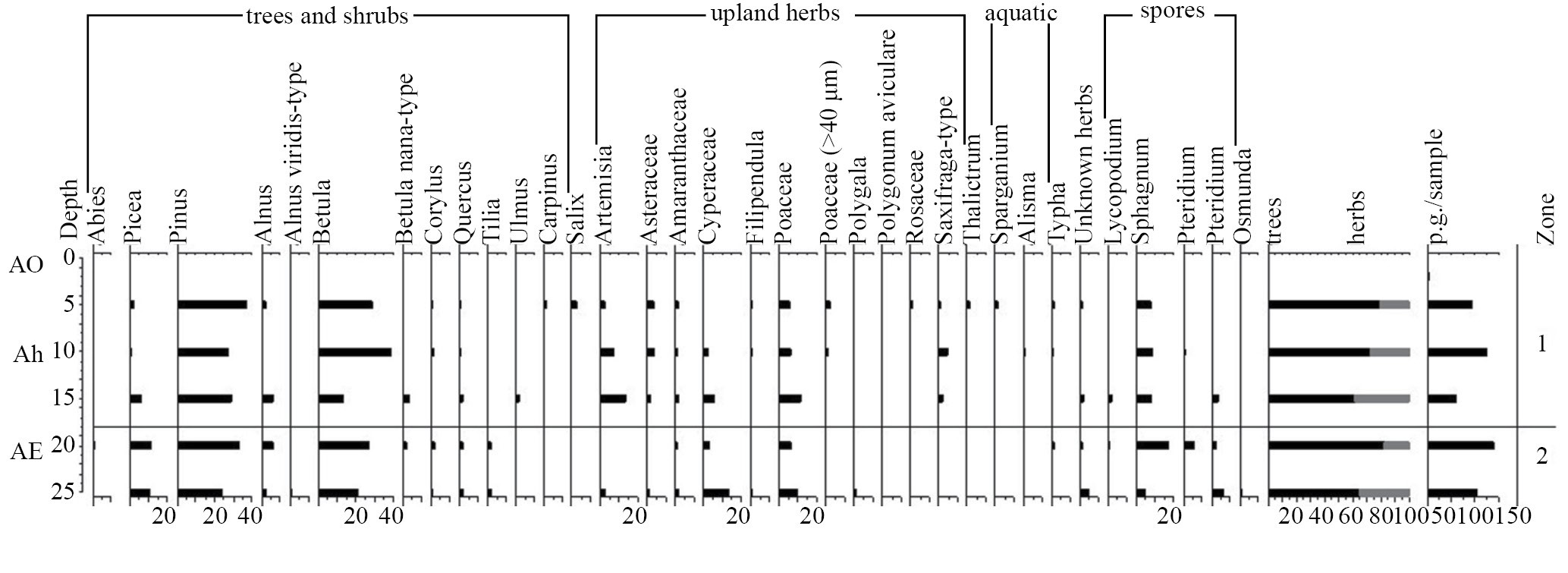 В горизонте АО (355–357(360) или [0–3(5)] см) пыльца практически отсутствовала, были встречены только единичные пыльцевые зерна.