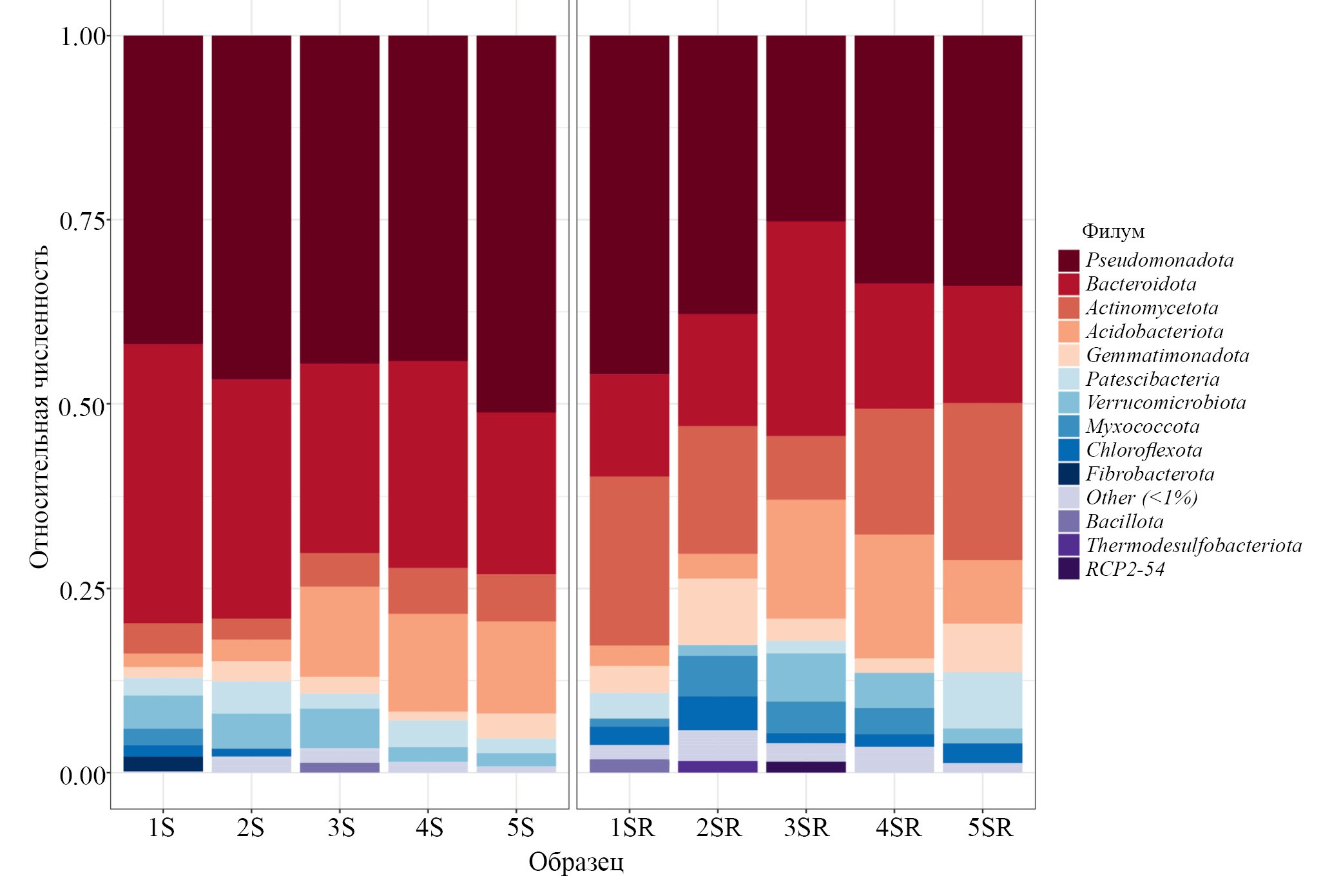 Рис. 1. Структура бактериальных сообществ изучаемых почв и ризосферы растений вейника наземного на уровне филумов. Таксоны, численность которых не превышает 1%, отмечены как Other. Образцы почвы без растений: 1S, 2S, 3S, 4S, 5S; образцы ризосферы: 1SR, 2SR, 3SR, 4SR, 5SR