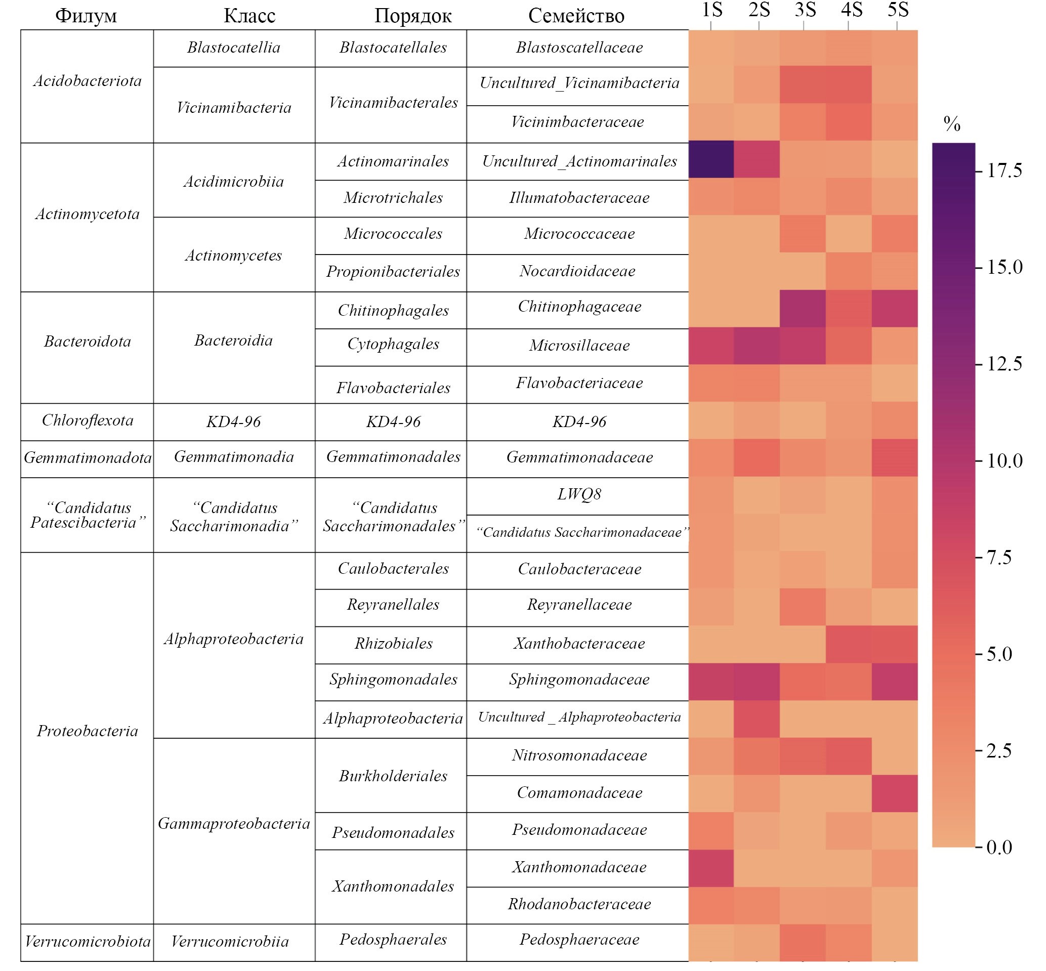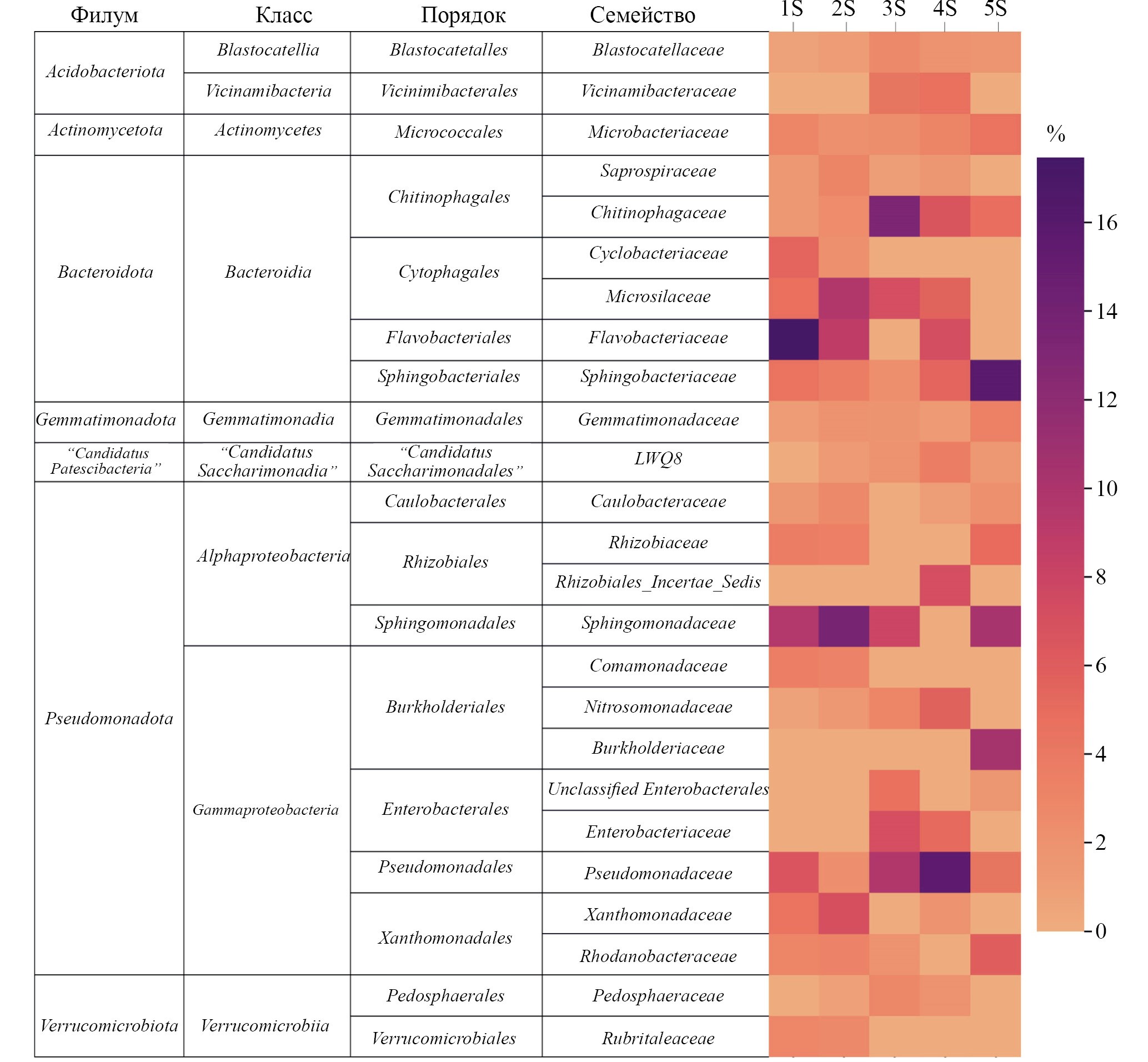 Рис. 2. Преобладающие семейства бактерий в почве без растений (показаны 25 семейств, характеризующихся наибольшим процентным содержанием). Тепловая карта отражает процентное содержание семейств в исследуемых образцах