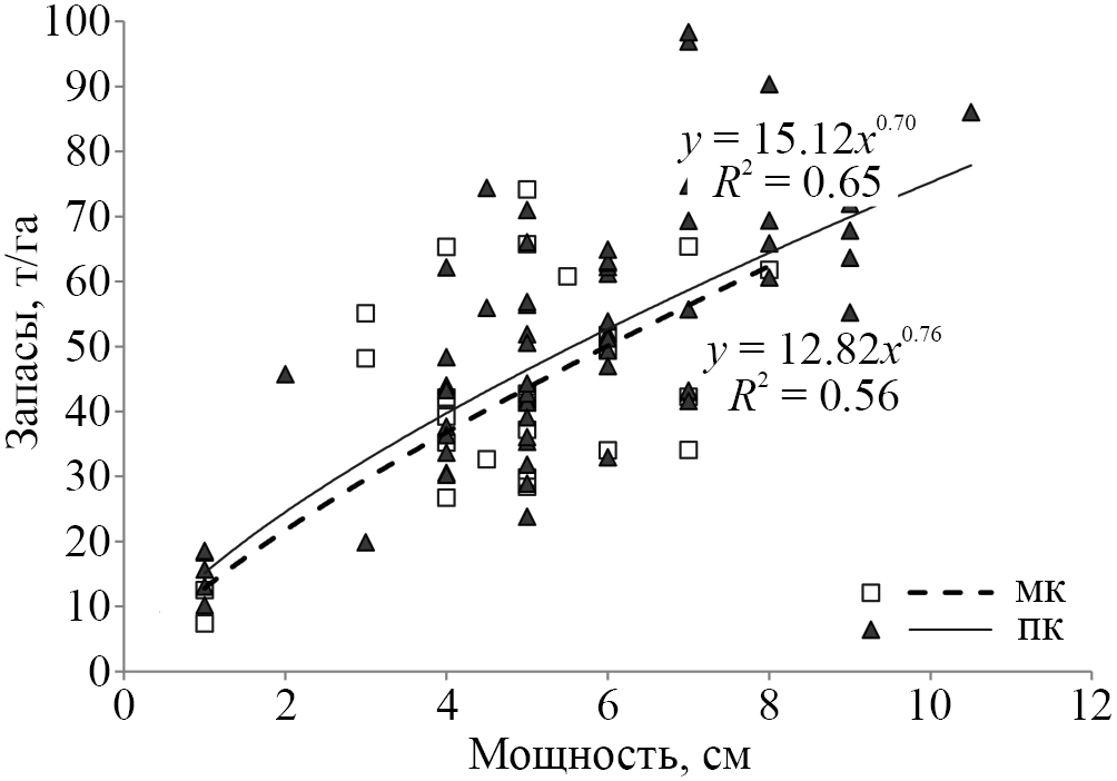 Построенные регрессионные модели (рис. 3) демонстрируют тесную связь между запасами подстилки и ее мощностью, выявленная зависимость выше для подкронового пространства по сравнению с межкроновыми позициями. Полученные результаты дополняет идею [60], что менее трудоемкие измерения мощности подстилки могут дополнить более сложный процесс отбора образцов для определения ее запасов, это позволит сократить количество отбираемых почвенных образцов или увеличить выборку для выявления пространственной неоднородности данного показателя.