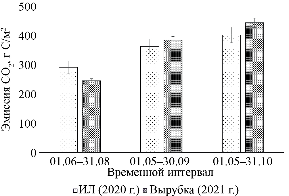 Эмиссию СО2 (или величину дыхания почвы – SR) измеряли инфракрасным газоанализатором LI-COR 8100 (LI-COR Inc., США) с почвенной камерой диаметром 20 см на стационарных основаниях высотой 10 см, которые были заглублены в лесную подстилку на 5 см в 6- и 7-кратной повторности на вырубке и в исходном лесу соответственно. Для расчета выноса углерода с дыханием почвы (C–CО2) применяли уравнение Вант-Гоффа и среднесуточные данные непрерывных измерений температуры почвы для летних месяцев, вегетационного (май–сентябрь) и бесснежного (май–октябрь) периодов согласно: