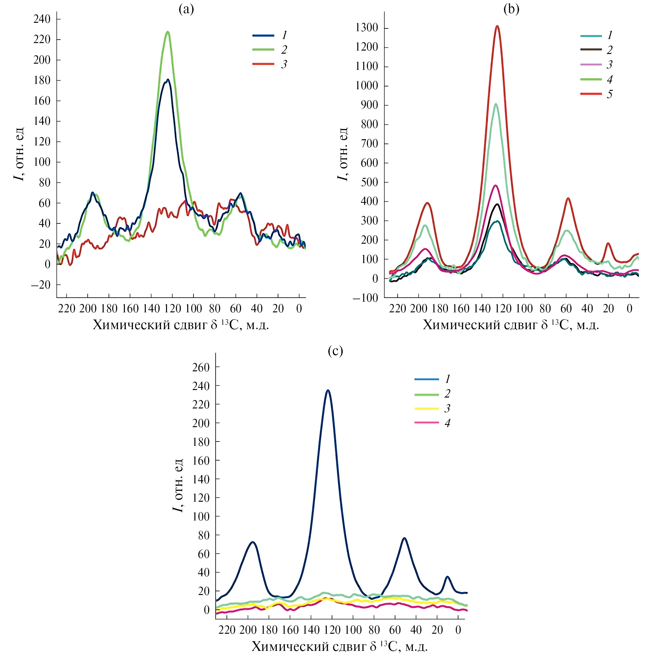 При этом форма и параметры ЯМР спектров биочара сильно зависят от типа сырья, его влажности, наличия включений и примесей, вида пиролизной обработки, параметров и режима пиролиза, например пиковой температуры пиролиза и его длительности и др. [17, 29, 47]. Поэтому среди исследователей существуют различные точки зрения на природу формы и параметров ЯМР-спектров. Тем не менее, в большинстве опубликованных работ [17, 22] содержится информация о наличии вклада в области 120–130 м.д. в CP/MAS 13C ЯМР спектрах биочара и почвы с биочаром, характерной для ароматических соединений. В работах [37, 38] подчеркивается вклад пиролизованного органического материала в формирование сигнала от алкильных групп и ослабевание арильных в изолированном органическом веществе почв при экспериментах по внесению биочара в почву.