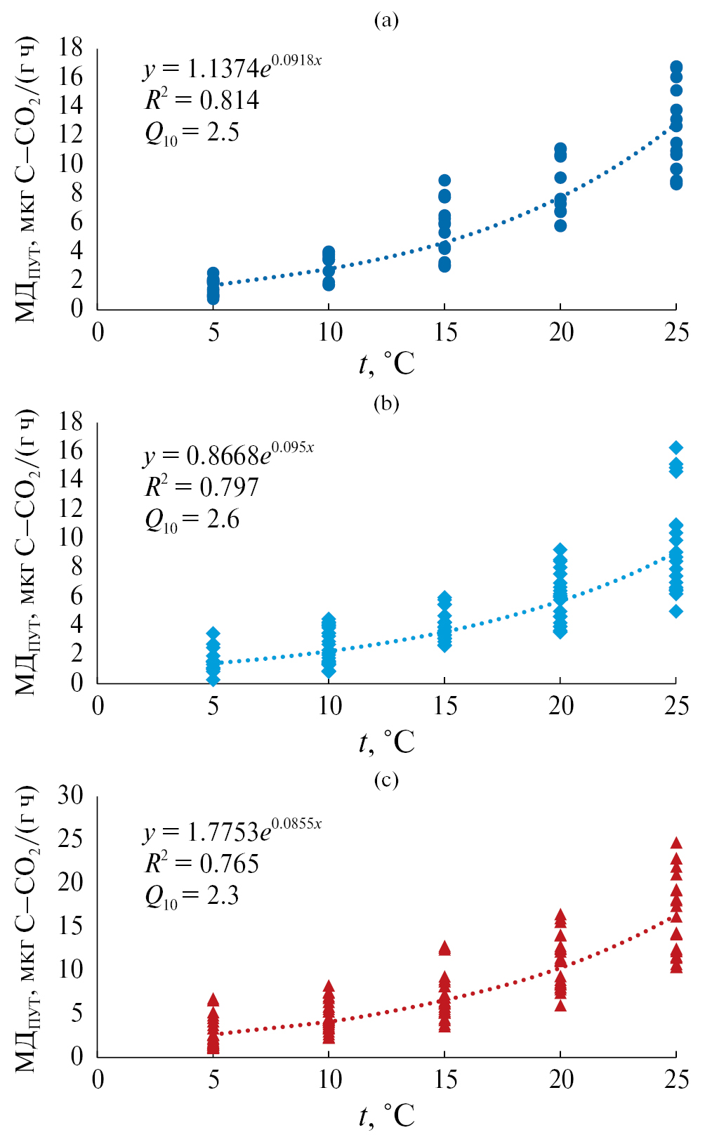 Рис. 2 Экспоненциальная зависимость скорости микробного дыхания (МДРВ) от температуры для образцов торфяных олиготрофных почв южной тундры (a), северной тайги (b) и подзоны хвойно-широколиственных лесов (c).