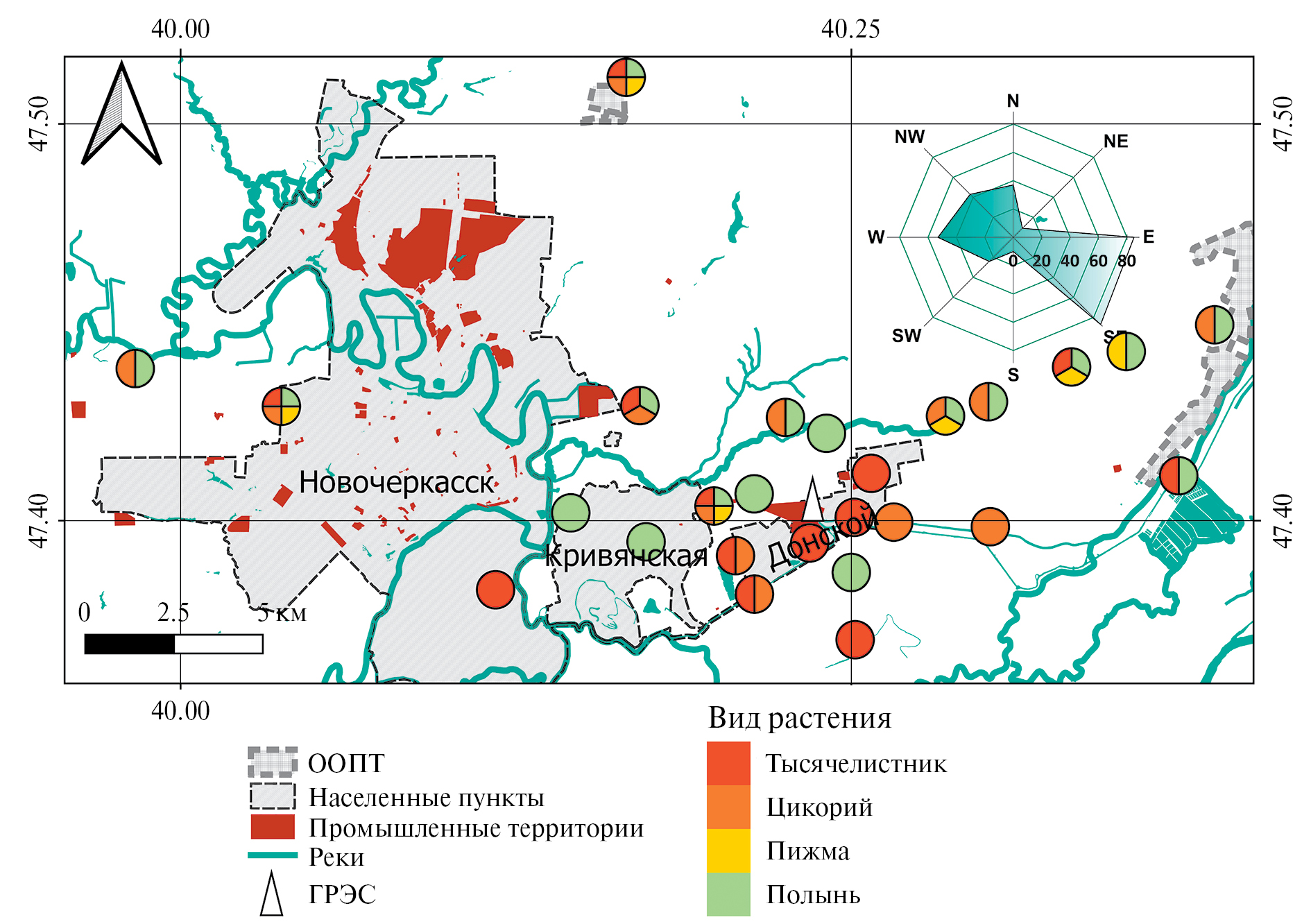 Объектом исследования являлись почвы и лекарственные растения, отобранные в зоне влияния крупнейшего в Ростовской области предприятия топливно-энергетического комплекса – филиала публичного акционерного общества “Вторая генерирующая компания оптового рынка электроэнергии” (ПАО “ОГК-2”) “Новочеркасская” ГРЭС (НчГРЭС), основной базовой электростанции в Ростовской энергосистеме. В качестве топлива используется донецкий уголь марки АШ. На долю этого предприятия приходится 1% всех выбросов поллютантов в атмосферу в РФ, в Ростовской области – >50%, в Новочеркасске – 90% [18, 28]. Отмечается, за последние несколько лет увеличились производственные мощности предприятия [28]. Основными компонентами выбросов НчГРЭС являются зола, сернистый ангидрид, оксиды азота. Выделяются в атмосферу большие объемы сажи (свыше 30 т/год), пятиокиси ванадия (около 8 т/ год), оксидов железа (свыше 5 т/год), хромового ангидрида (около 0.1 т/год), диоксида Mn (около 0.15 т/год), оксида Ni (1.5 кг/год), фтористого водорода (7 кг/год) [19, 48]. В твердофазных атмосферных выпадениях территории исследования содержится в 13 раз больше Zn, в 7–8 раз больше Pb и Cu и в 1.5–2 раза больше Ni, Cr и Cd по сравнению с региональным фоном [28].