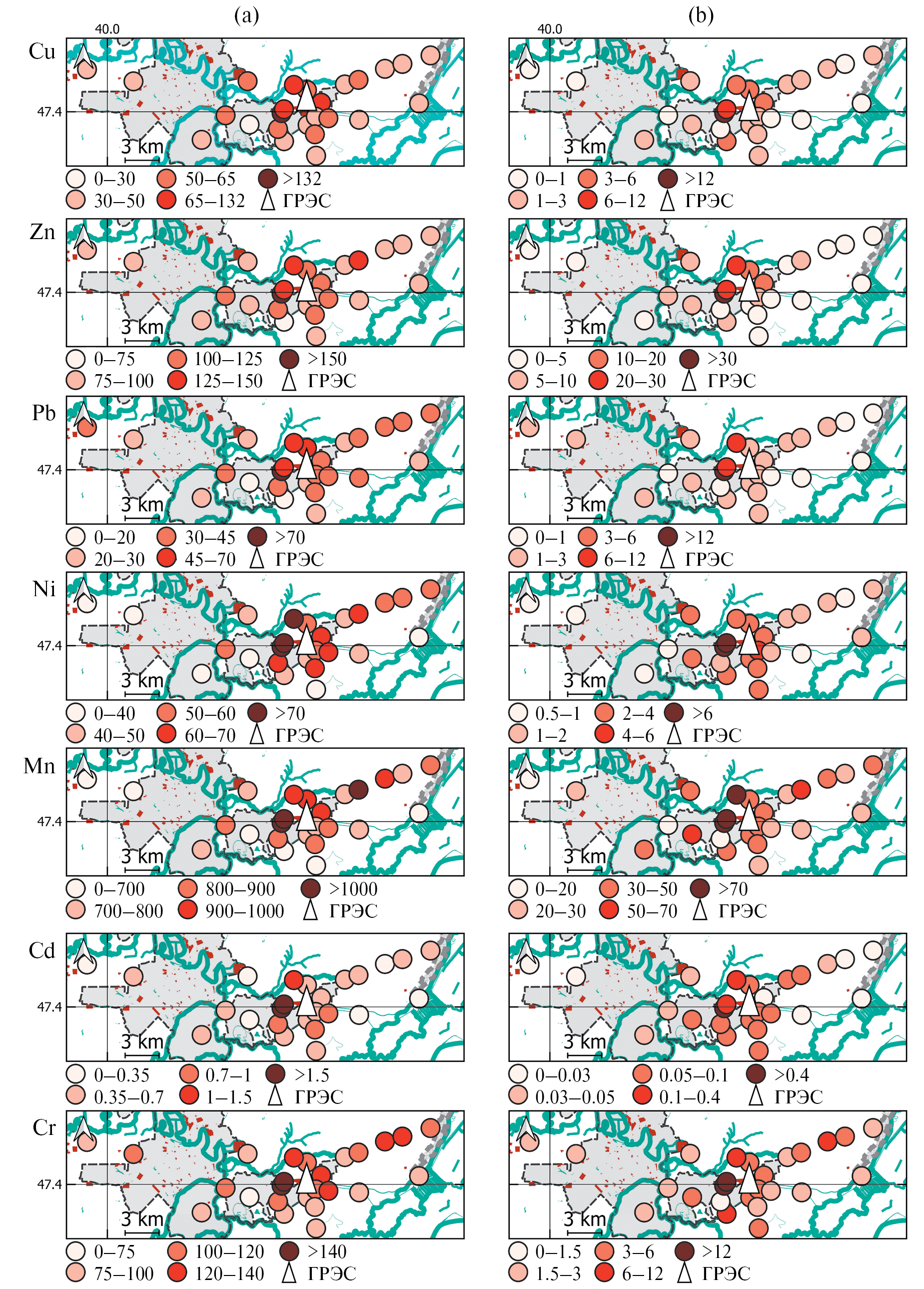 4. Fig. 2. Spatial distribution of gross content (a) and mobile forms (b) of heavy metals in soils of the impact zone of the power plant.