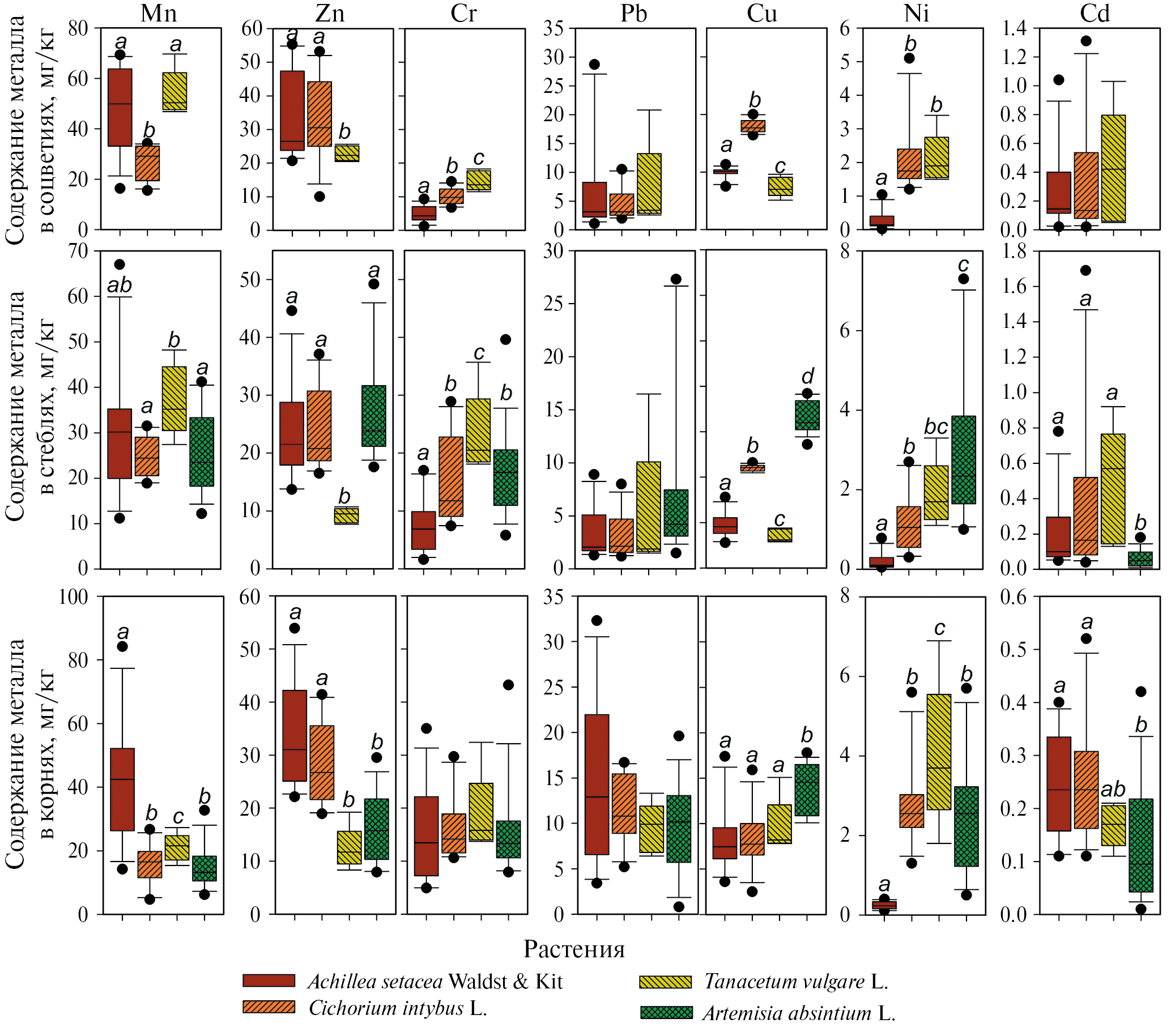 Помимо почвы, источником поступления ТМ в растения являются и оседающие на листовой поверхности аэрозольные частицы, становясь источником дополнительного так называемого фолиарного загрязнения. Накопление ТМ в лекарственных растениях фолиарным путем, в обход барьеров на границе почва–корневая система и корни–надземная часть, ограничивает возможности использования в медицине данного региона лекарственных растений. Поэтому одной из наиболее актуальных проблем в лекарственном растениеводстве является анализ возможности использования в лечебных целях растений, произрастающих в условиях техногенного прессинга, поскольку основную часть заготовок сырья проводят в населенных и промышленно освоенных регионах [13, 14]. Видовые особенности являются одним из важнейших факторов поступления и накопления элементов [34, 36, 41, 47, 52]. Дикорастущие растения обладают большей устойчивостью к загрязнению ТМ по сравнению с сельскохозяйственными культурами [50]. Это означает, что дикорастущие виды способны аккумулировать в себе большее количество ТМ, не подвергаясь эффекту токсикации и, как следствие, не иметь внешних проявлений опасного уровня содержания поллютантов.
