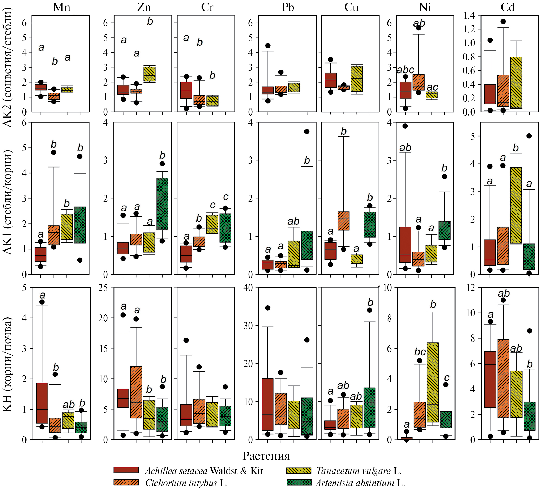 7. Fig. 5. Redistribution coefficients of heavy metals in the soil–root (KN), root–stem (AK1) and stem–inflorescence (AK2) systems. Letters indicate significant differences obtained using Tukey honest significant difference for unequal N at p < 0.05.