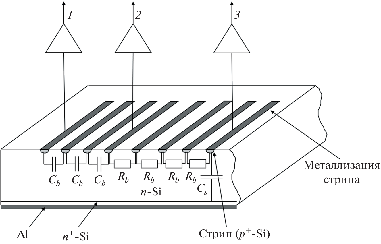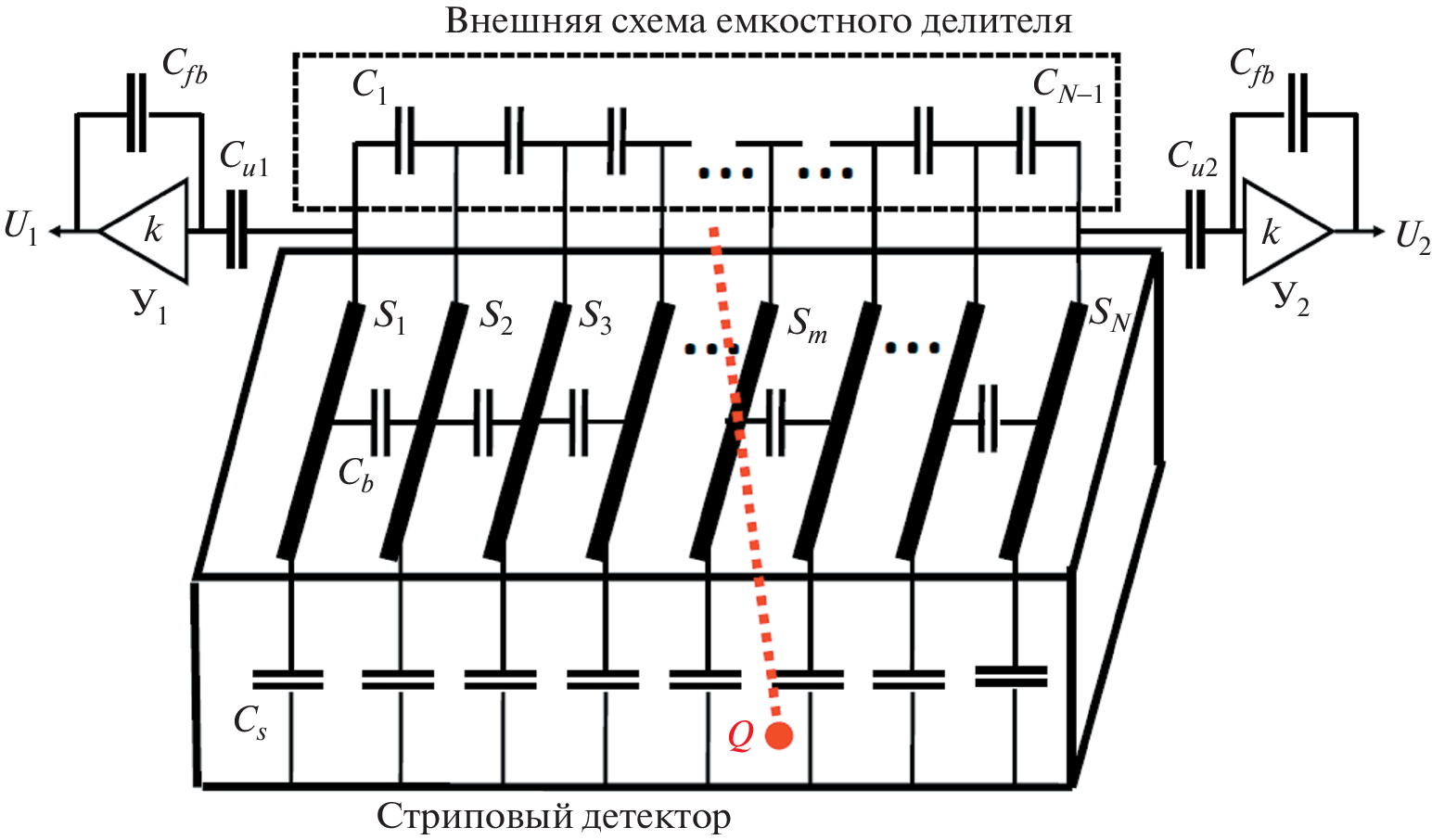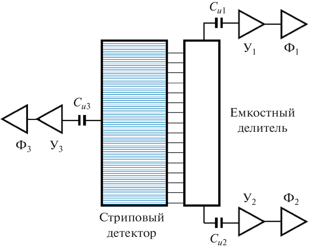The article considers an electronic circuit that, in some cases, makes it possible to significantly reduce the number of readout channels in a silicon coordinate detector based on a matrix of p–i–n structures (strip- or pad-type) without a loss in the coordinate measurement accuracy. The electronic circuit is a chain of external capacitors that connect the structures of the detector. When one of the structures is hit, a signal propagates along the chain of capacitors of the capacitive divider to the nearest readout channels and it is possible to determine the original number of the hit structure by the change in the signal value. The proposed circuit was mathematically simulated for typical parameters of the detector and readout electronics. The mathematical model allowed us to optimize the circuit parameters depending on the parameters of the detector and readout electronics. The simulation results are confirmed by experimental measurements on several prototypes of the device. It is shown that, in certain application cases, when a detector signal is high enough, e.g., when nuclei with Z > 6 are registered, one can achieve, by using standard low-noise operational amplifiers, the accurate recovery of the number of the hit structure in the chain consisting of at least 30 structures by reading only two extreme structures.