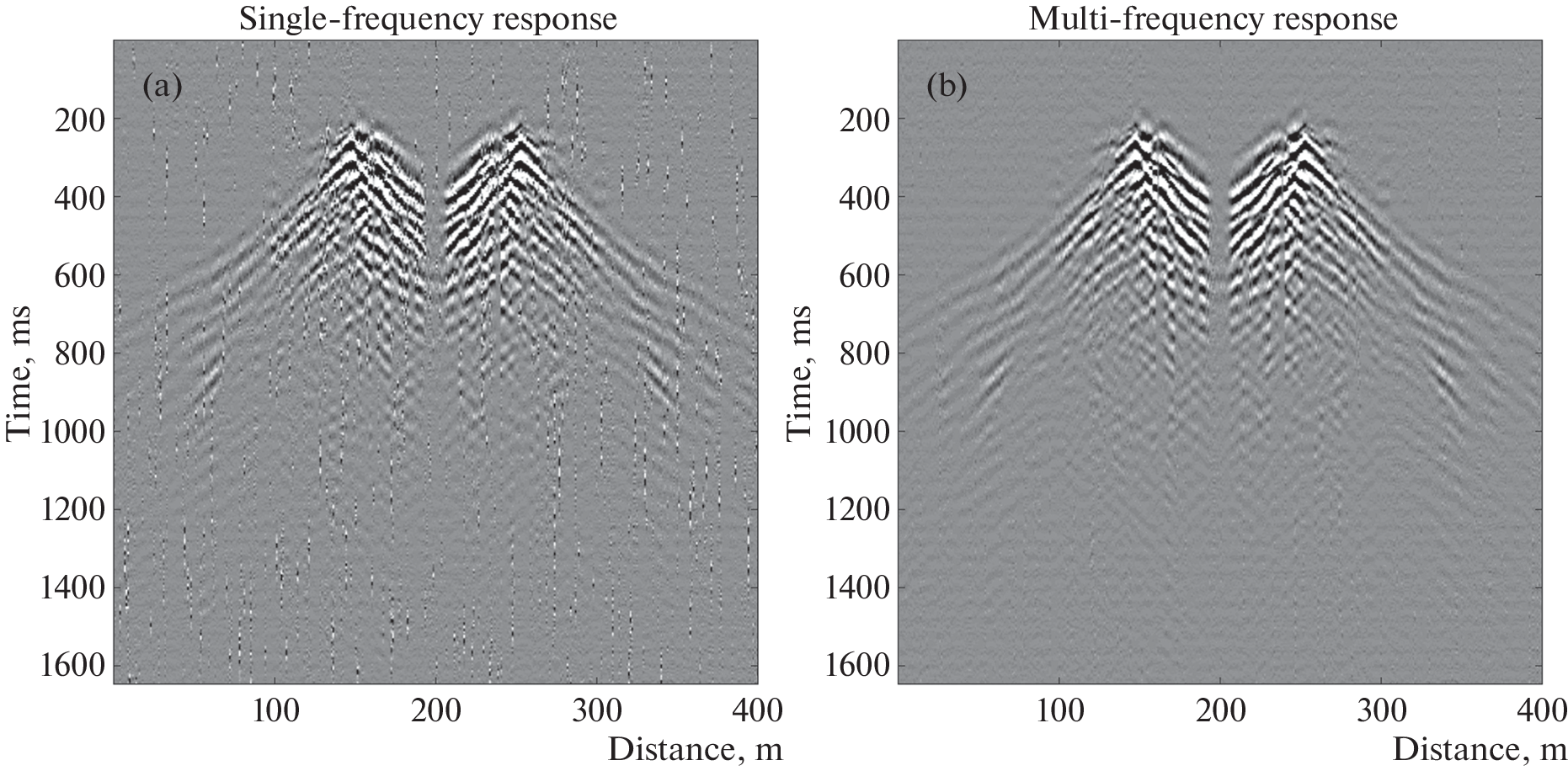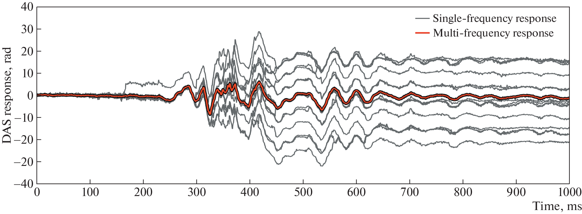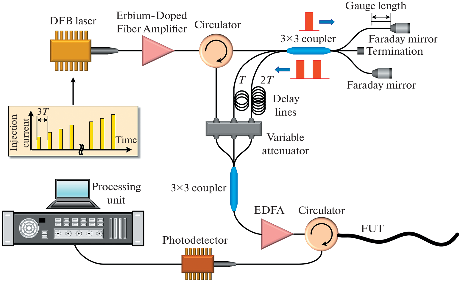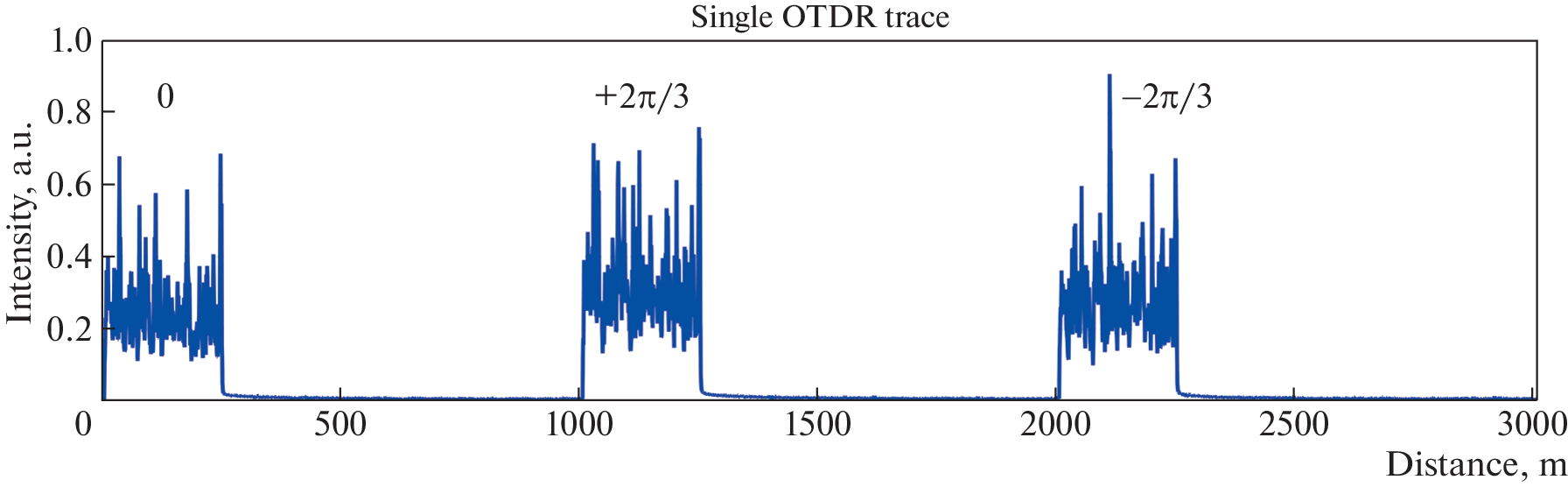 Предложена новая архитектура волоконного когерентного фазового рефлектометра (распределенного датчика акустических воздействий, φ-OTDR) с возможностью его применения в задачах инженерной геологии. Датчик основан на двухимпульсной схеме, в которой пара импульсов формируется с помощью несбалансированного интерферометра Майкельсона. Необходимая для осуществления демодуляции обратно-рассеянного излучения фазовая задержка формируется с помощью симметричного ответвителя 3 × 3, встроенного в интерферометр. Использование несбалансированного интерферометра в схеме генерации двойных зондирующих импульсов позволяет снизить требования к степени когерентности источника излучения, так как вносимая временная задержка между двойными импульсами компенсируется в волоконном тракте рефлектометра. Это позволяет использовать в качестве источника излучения лазер с относительно широкой спектральной линией, около 1 ГГц, а также формировать короткие импульсы лазерного излучения (с длительностью 7 нс) путем прямой модуляции тока инжекции лазерного диода. Для снижения замираний сигнала в рефлектометре, а также для улучшения линейности его отклика используется усреднение откликов по 16 оптическим частотам. Работоспособность распределенного акустического датчика была продемонстрирована при детектировании сильного ударного воздействия на горизонтально закопанный в грунт кабель, а также при регистрации сейсмических волн с помощью кабеля, размещенного в скважине на дне моря.
